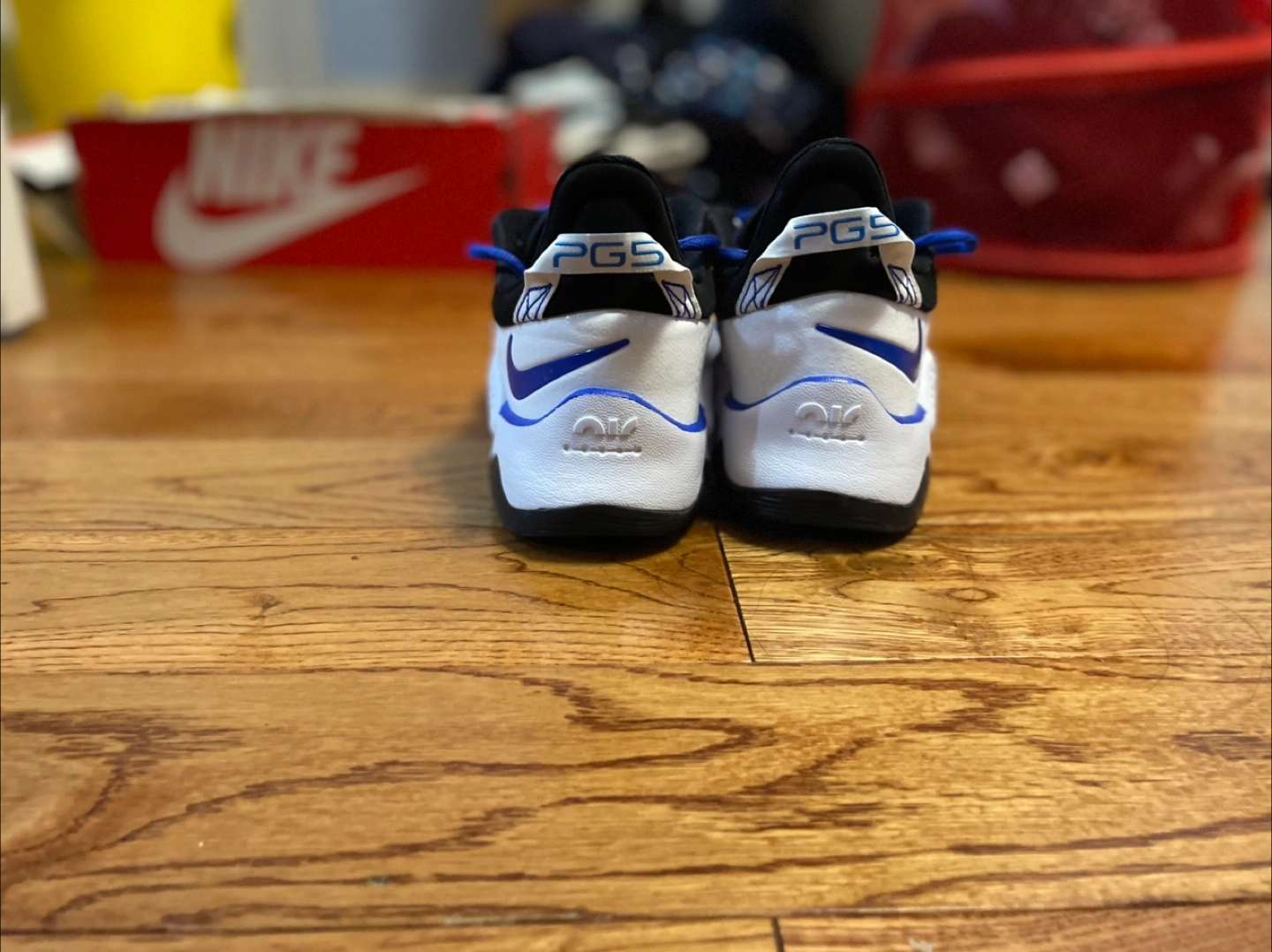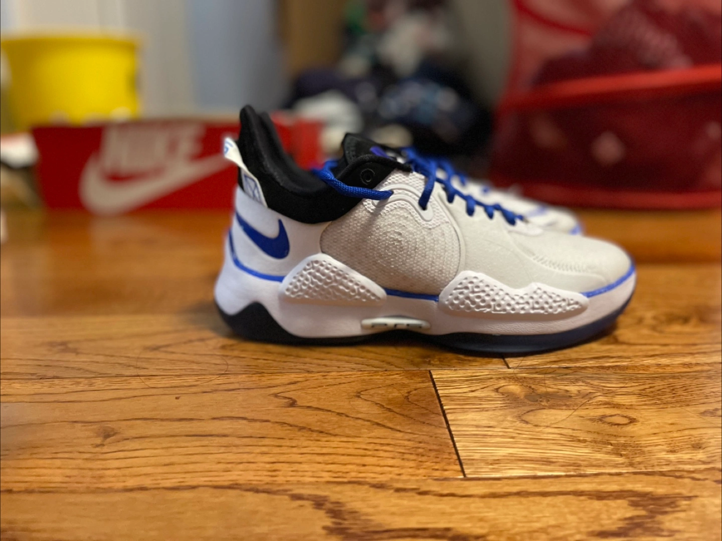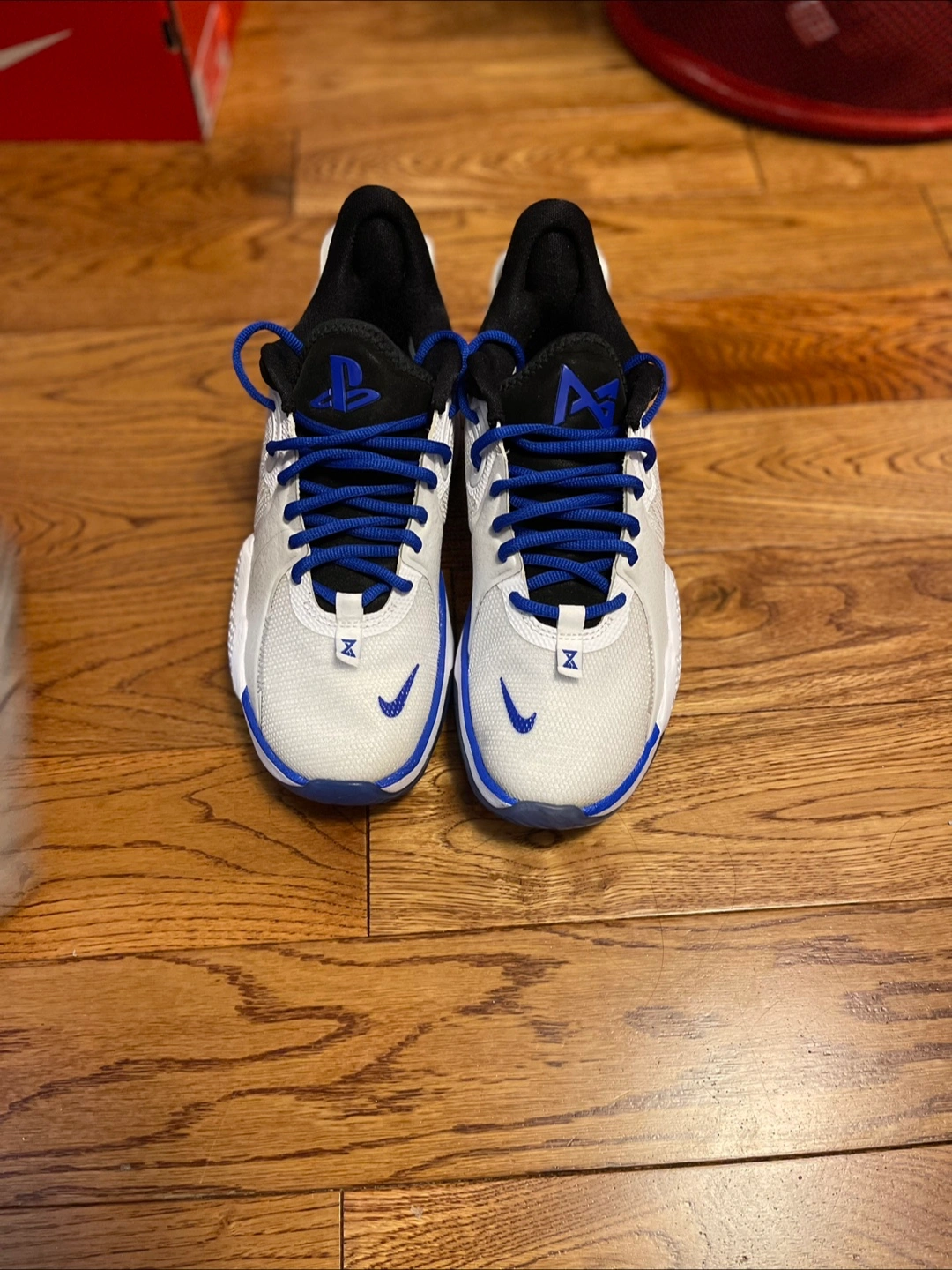 Selling a pair of Nike PG 5 Playstation shoes in white and blue. They are a US size 6. Great for basketball or casual wear! - No box - No extra laces - Price negotiable - meetups only