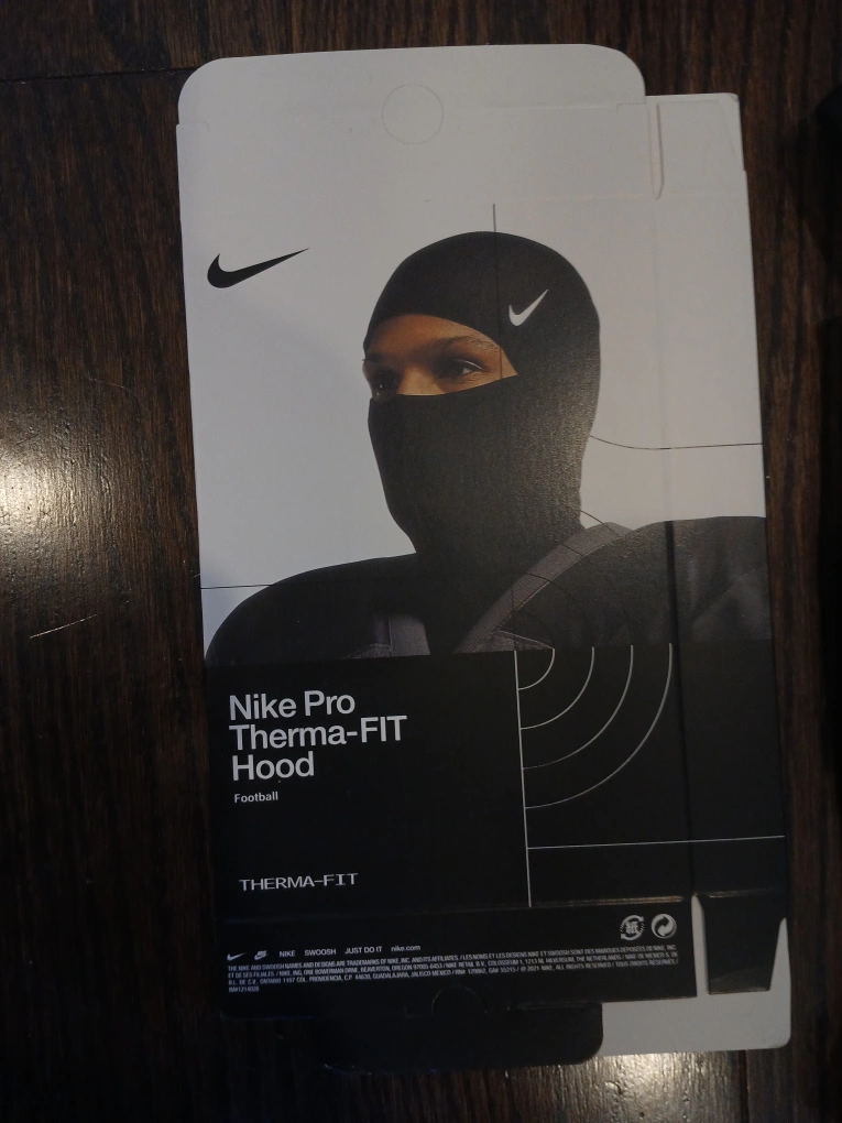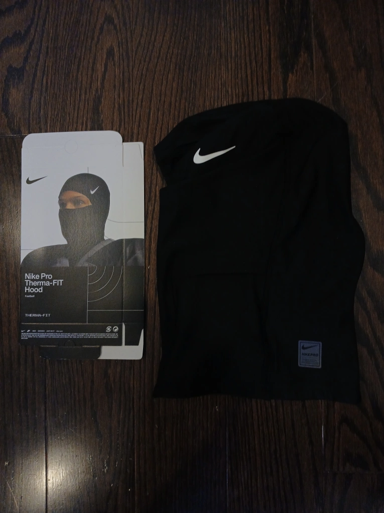 Selling a Nike Pro Therma-FIT Hood in black. It's in great condition and comes with the original box. This hood features Therma-FIT technology to help keep you warm and comfortable during colder weather activities. The Hyperwarm material provides additional insulation. Perfect for football or any outdoor activity!