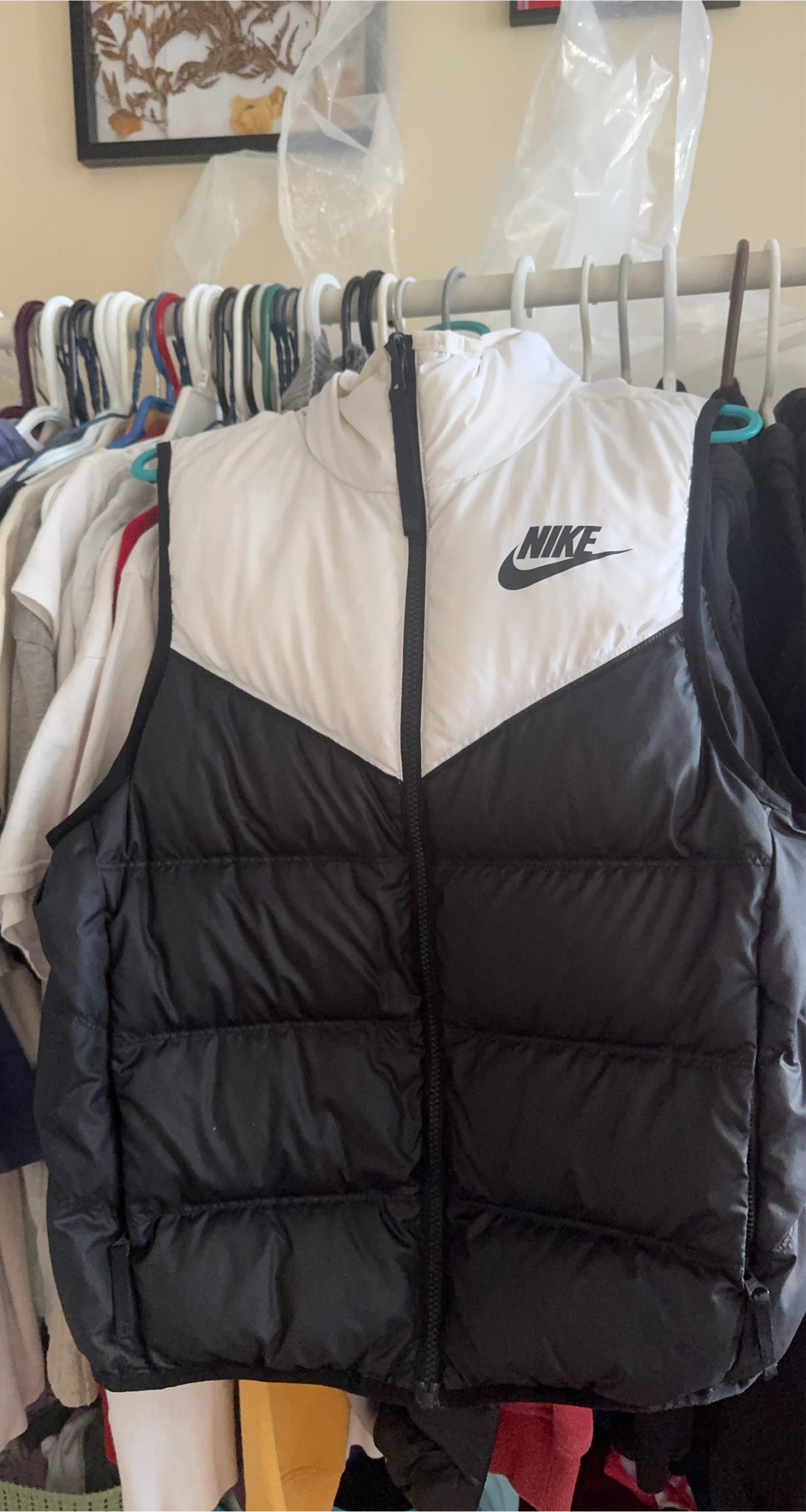 60Selling a Nike puffer vest in a stylish black and white colourway. It's in great condition and perfect for layering! The iconic Nike logo is prominently displayed. A great addition to your wardrobe for extra warmth and style.