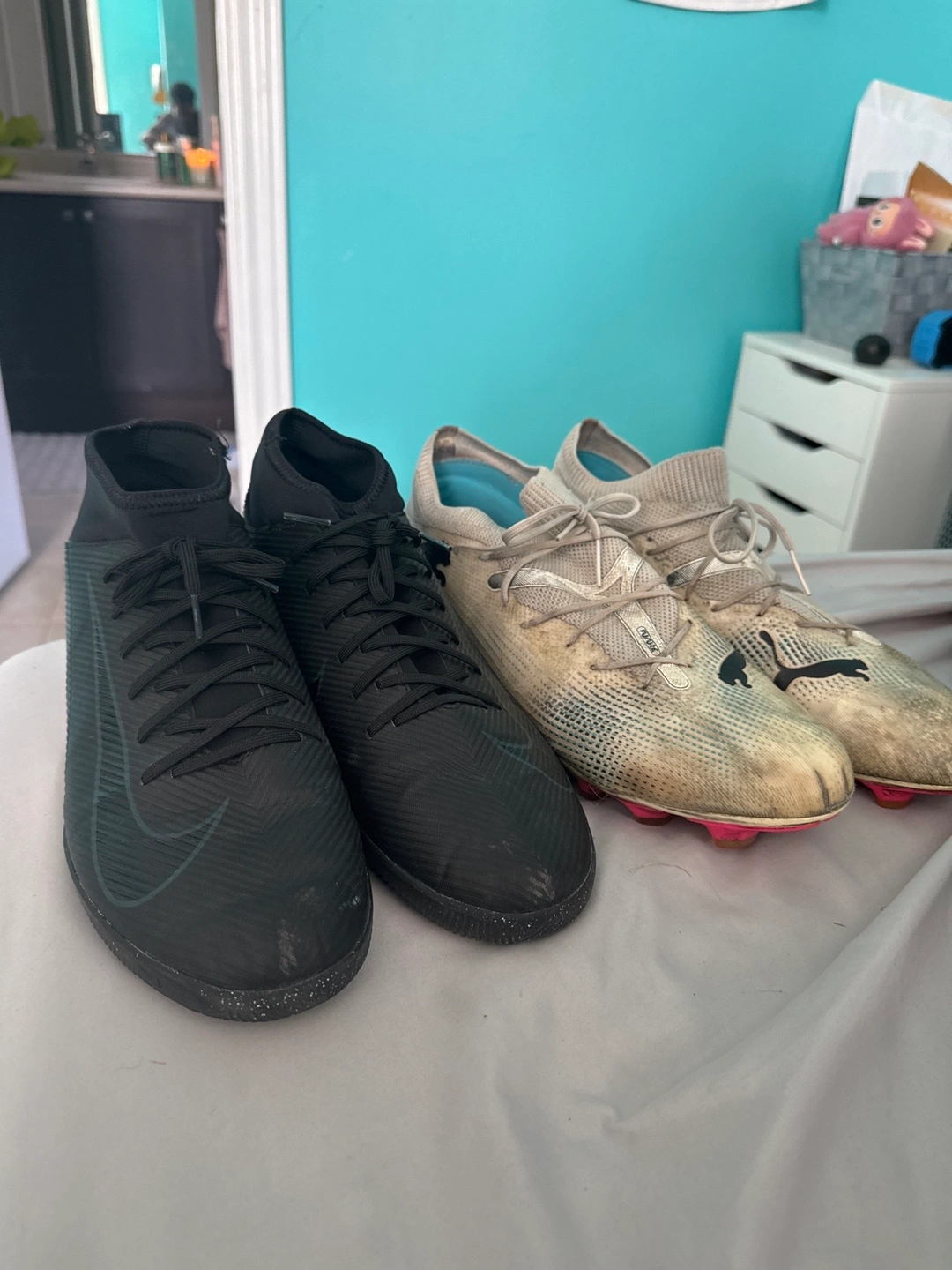 Selling a pair of Nike and Puma soccer cleats. They have some signs of wear, but still have lots of life left in them for the field. 100 each, Nike cleats are indoor while the Pumas are firm ground both size 12