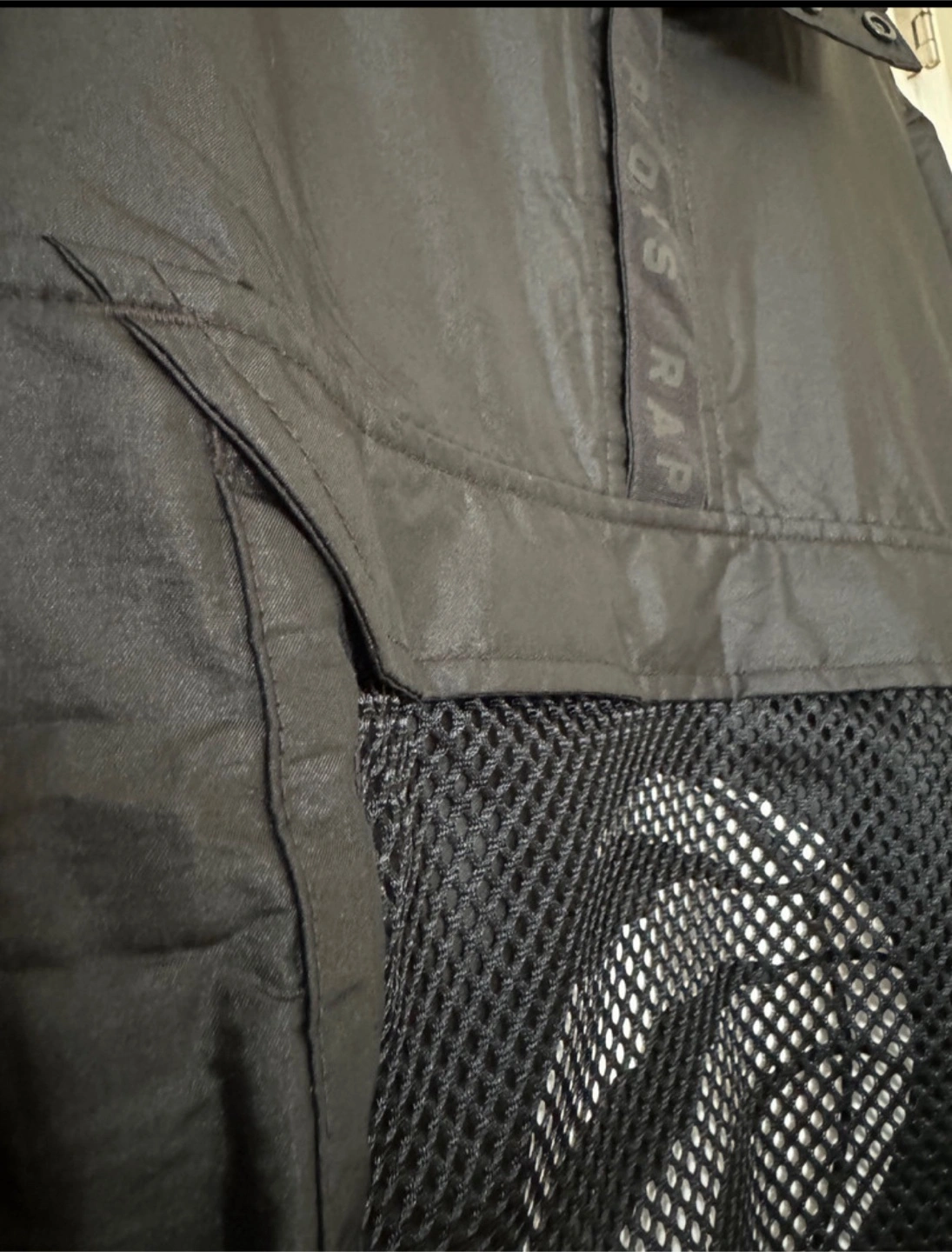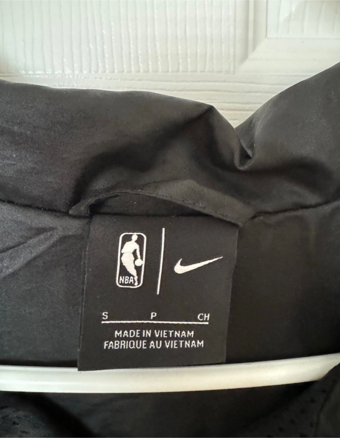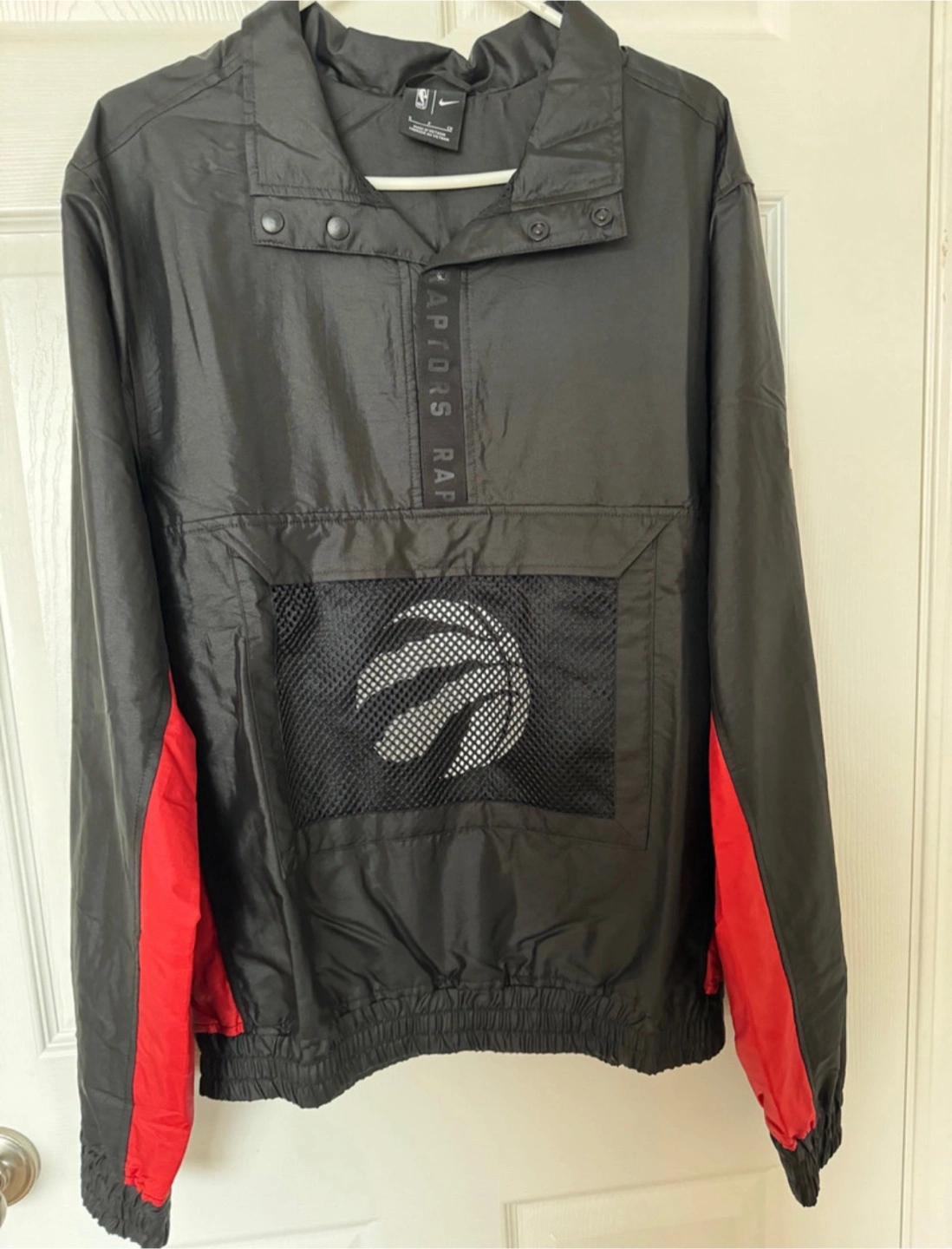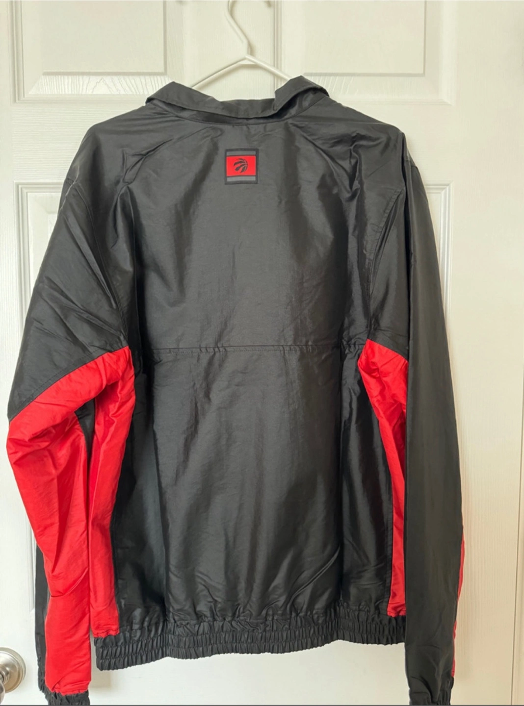 10A black jacket with red accents. There is a Raptors logo on the chest. It is made with durable material. This jacket would be perfect to wear on a cool evening walk.