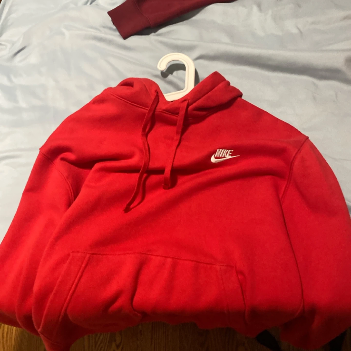 Selling a Nike red hoodie in size medium! It's in great condition and ready for a new home. The classic Nike logo is embroidered on the front. Made in Sri Lanka.