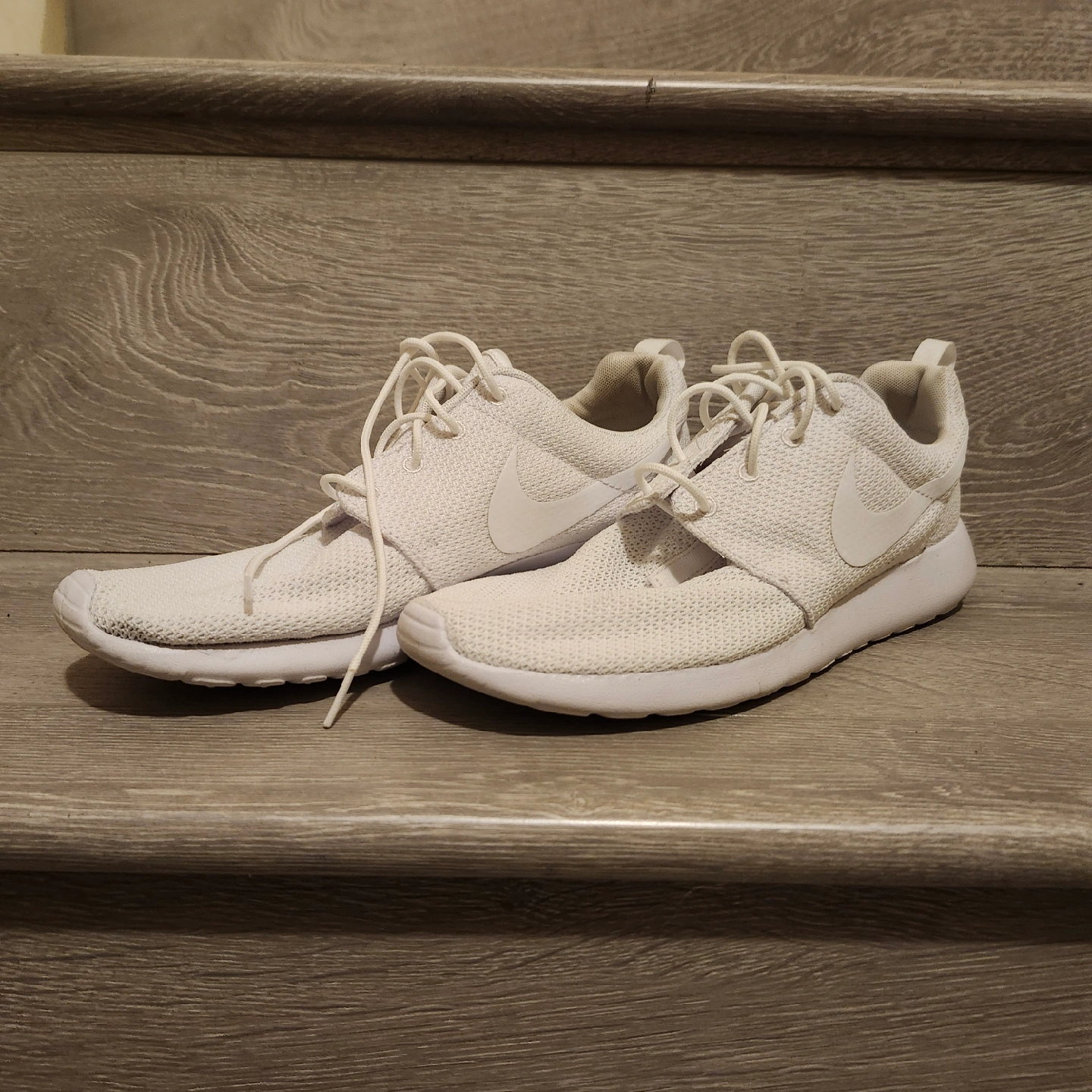 Selling a pair of Nike Roshe One sneakers in all white. They are in good condition and very comfortable for everyday wear. Great for running errands or just kicking around town!