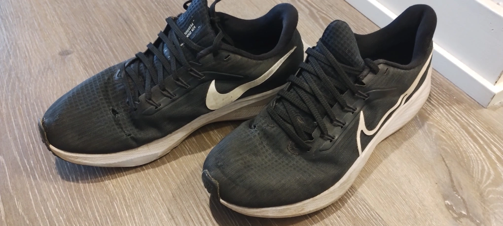 39Black running shoes with white accents. Lace-up closure. Used, size doesn't fit anymore.