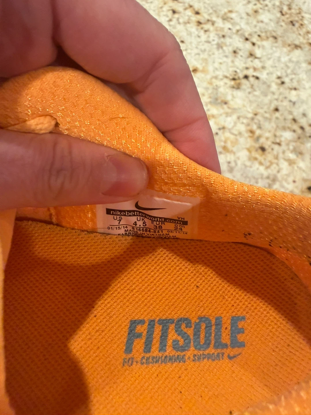 5Selling a pair of women's Nike running shoes in size 6. They have a vibrant orange colour and feature Nike's Fitsole cushioning for support. Great for running or everyday wear!