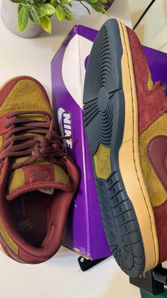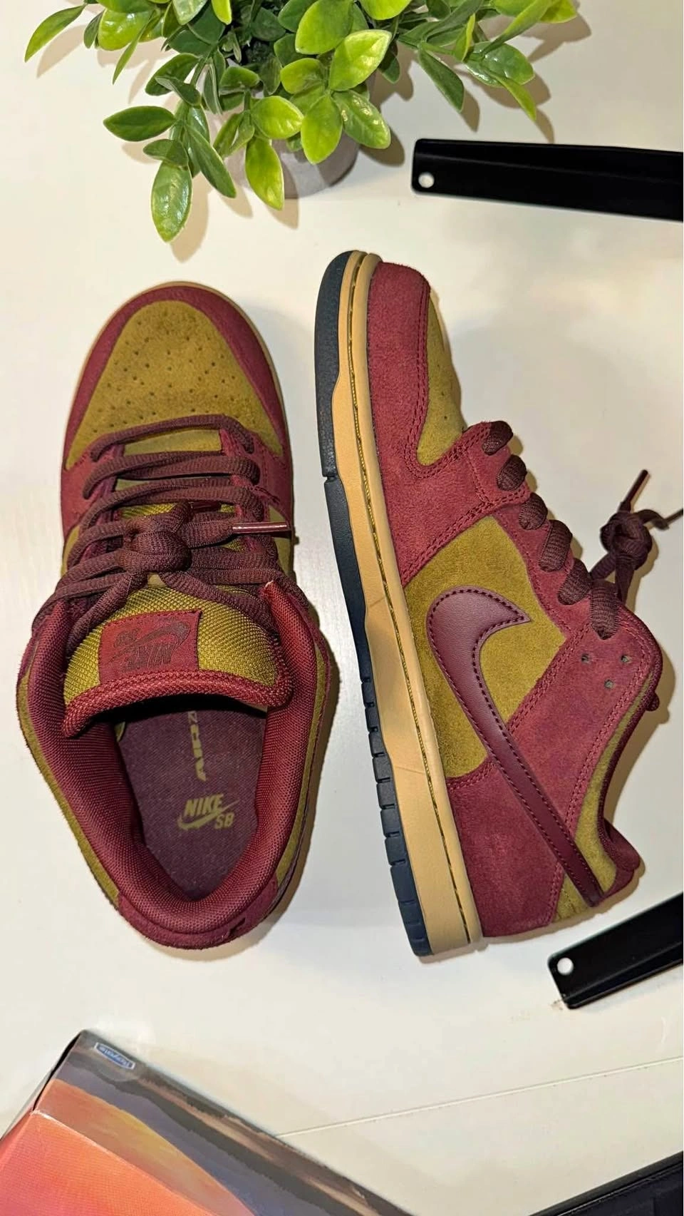 60Got these Nike SB Dunk Low pro as a birthday gift — unique colorway (maroon & olive mix), but had one already. Never worn, just tried on once. Comes with gift receipt and original box.