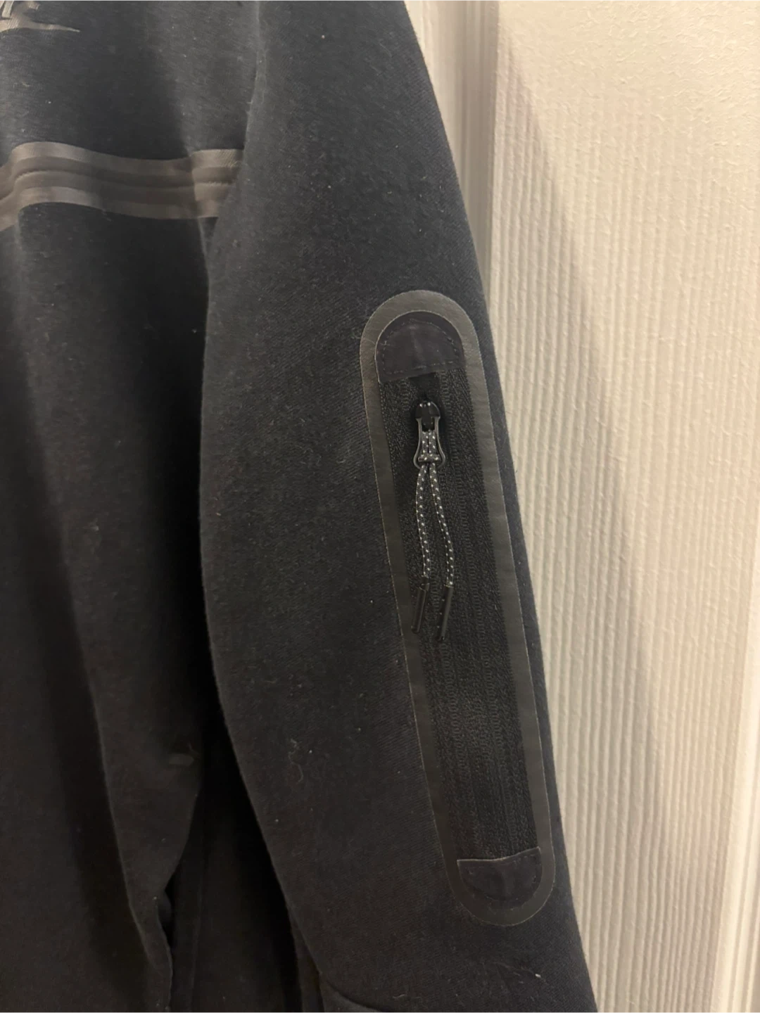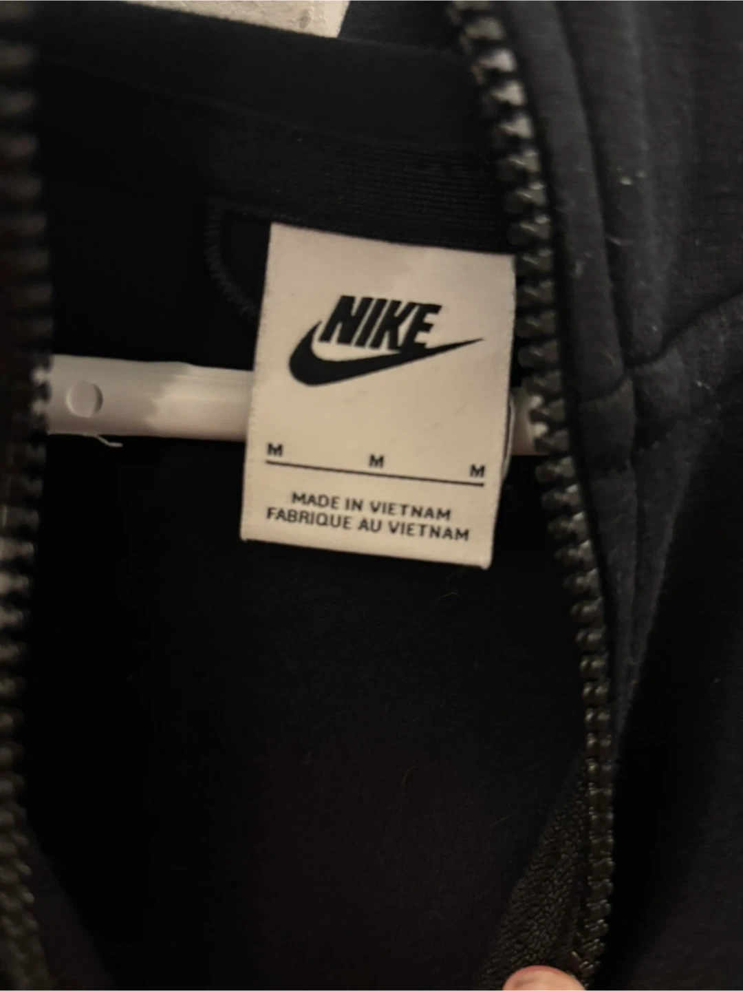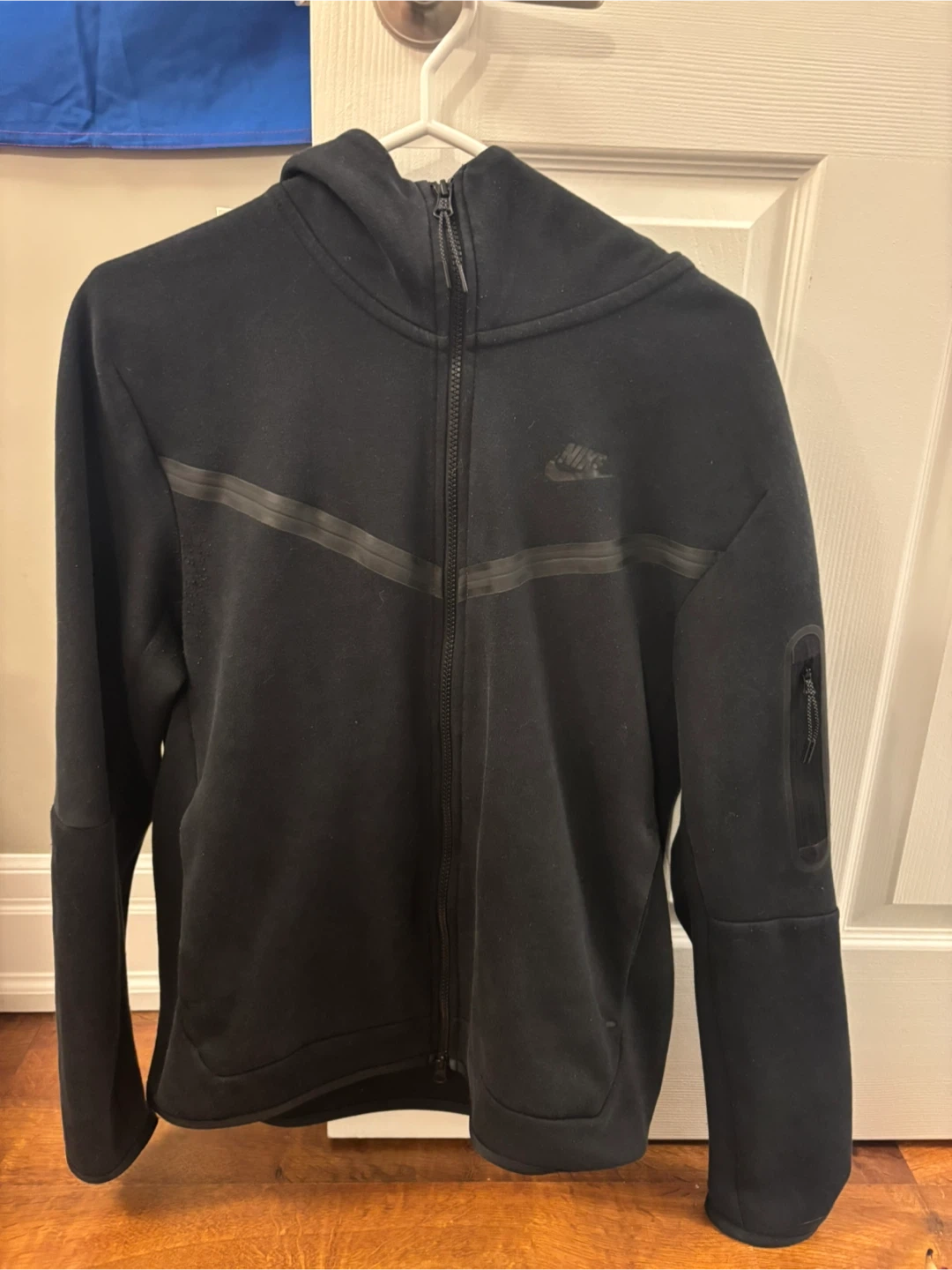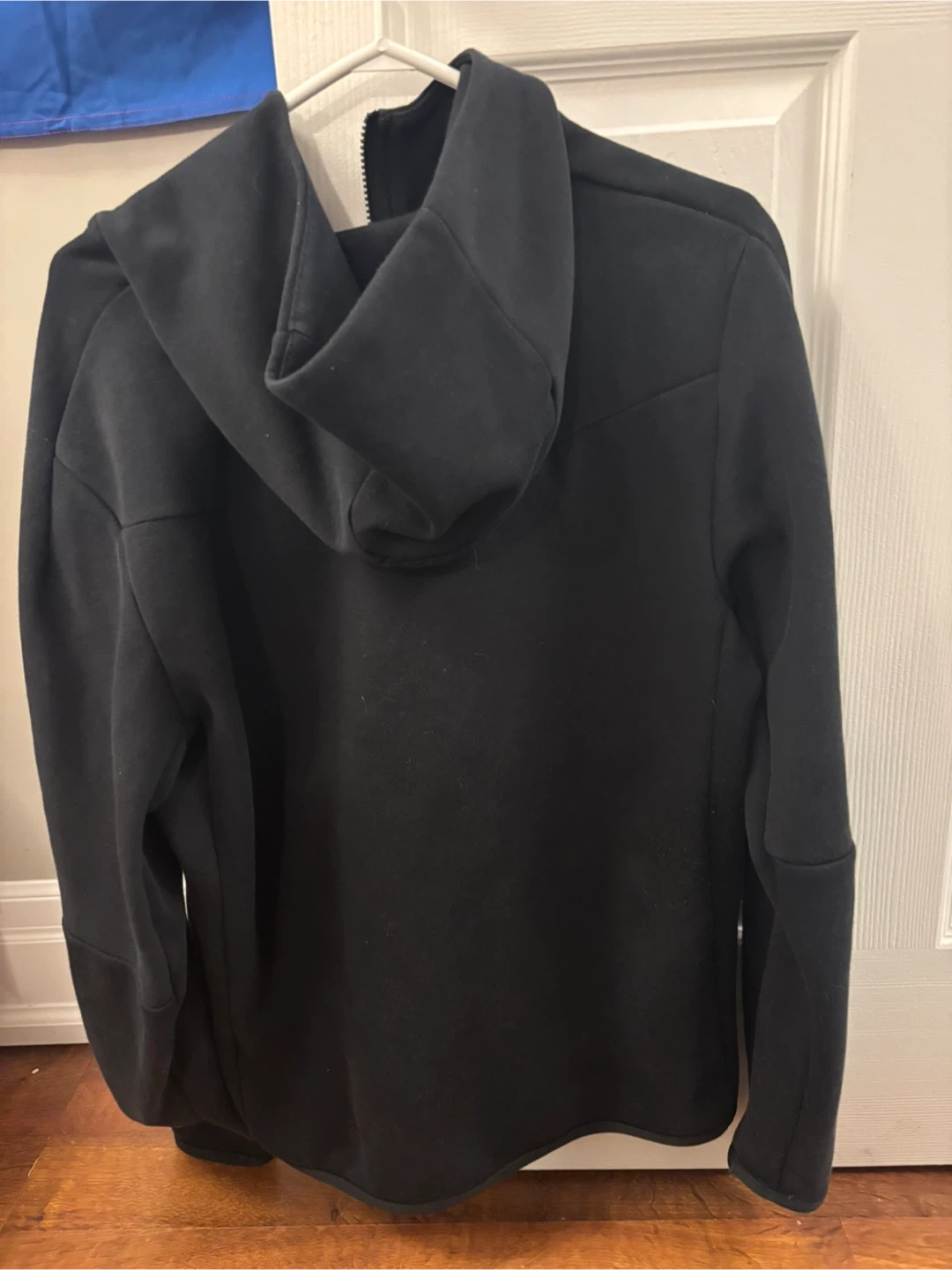 Selling a Nike Tech Fleece hoodie in black, size medium. It's in great condition and features the signature Tech Fleece material, providing warmth without the bulk. It also has a zippered pocket on the sleeve. Perfect for layering or wearing on its own!