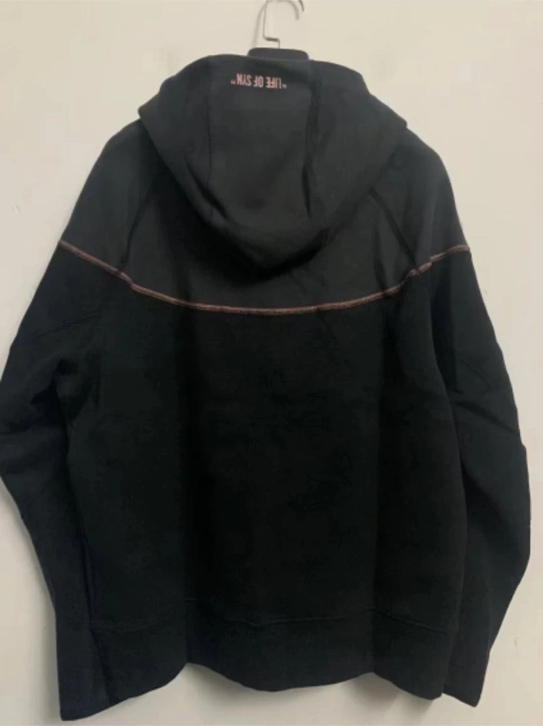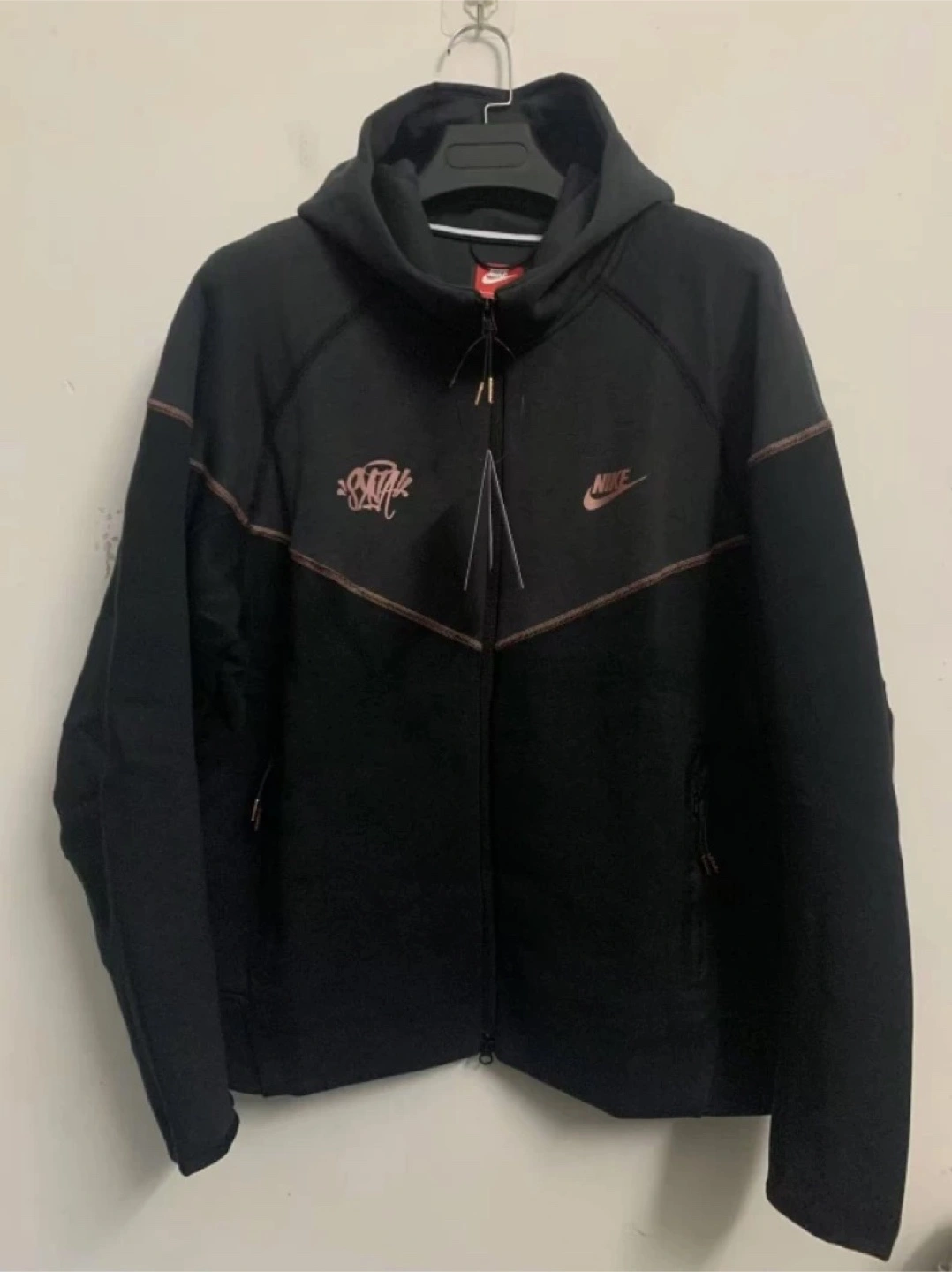 10Men's Nike Tech Fleece zip-up hoodie. Black with rose gold accents. Size Features a kangaroo pocket and a drawstring hood.