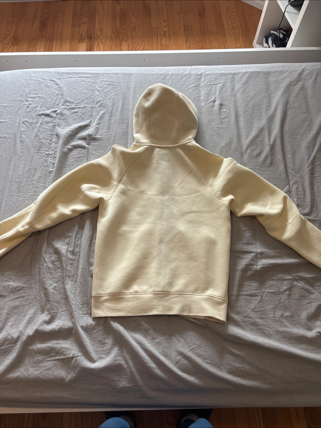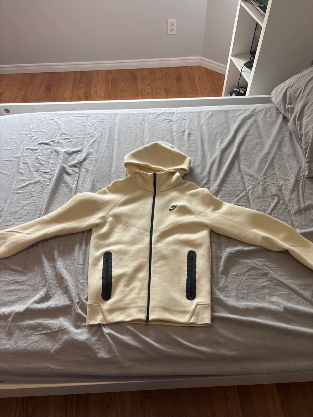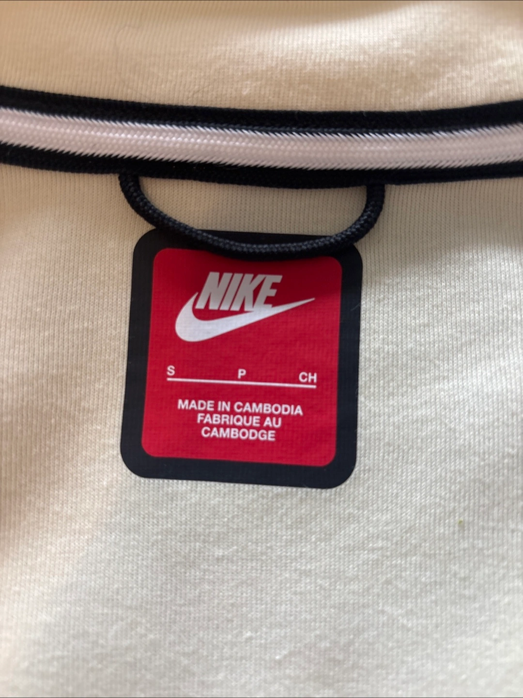 Cream coloured Nike Tech Fleece zip-up hoodie. Size small. Features a small Nike logo on the chest and zippered pockets.