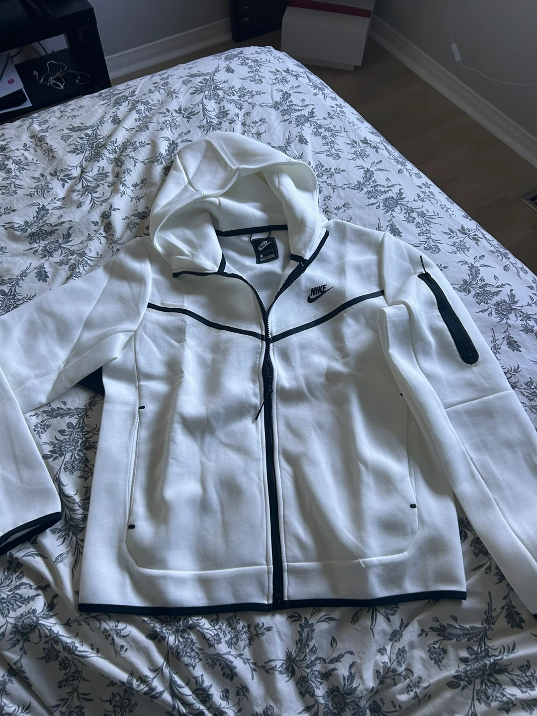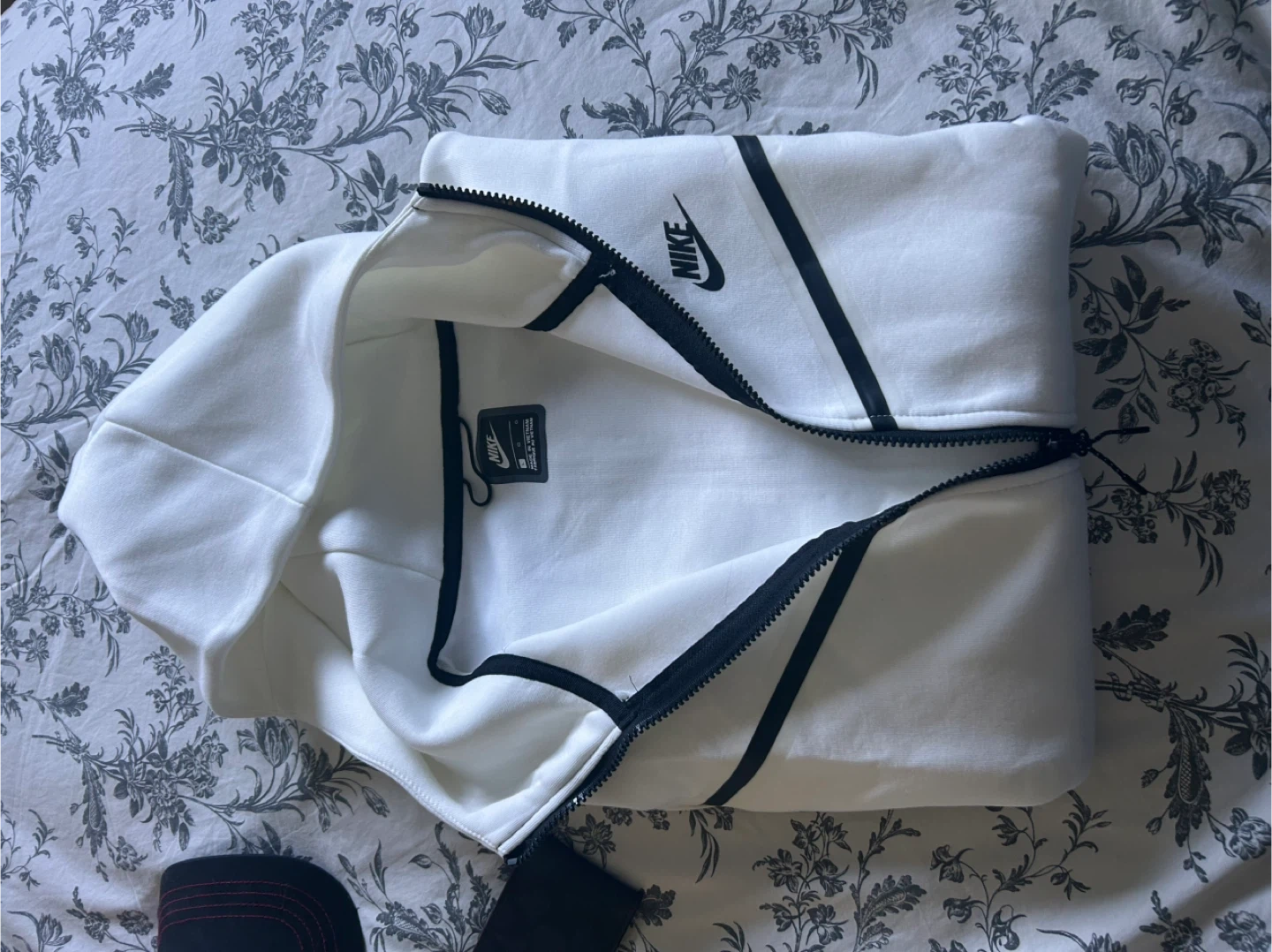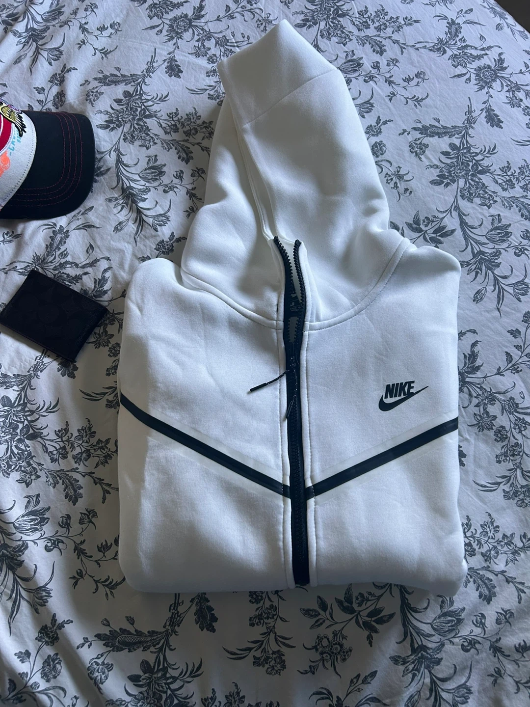 71Selling a Nike Tech Fleece hoodie in white. Worn once not my size. It’s in great condition and super comfy for everyday wear! The classic design with the black accents makes it a stylish choice. Perfect for layering or wearing on its own. Size is L Men’s.
