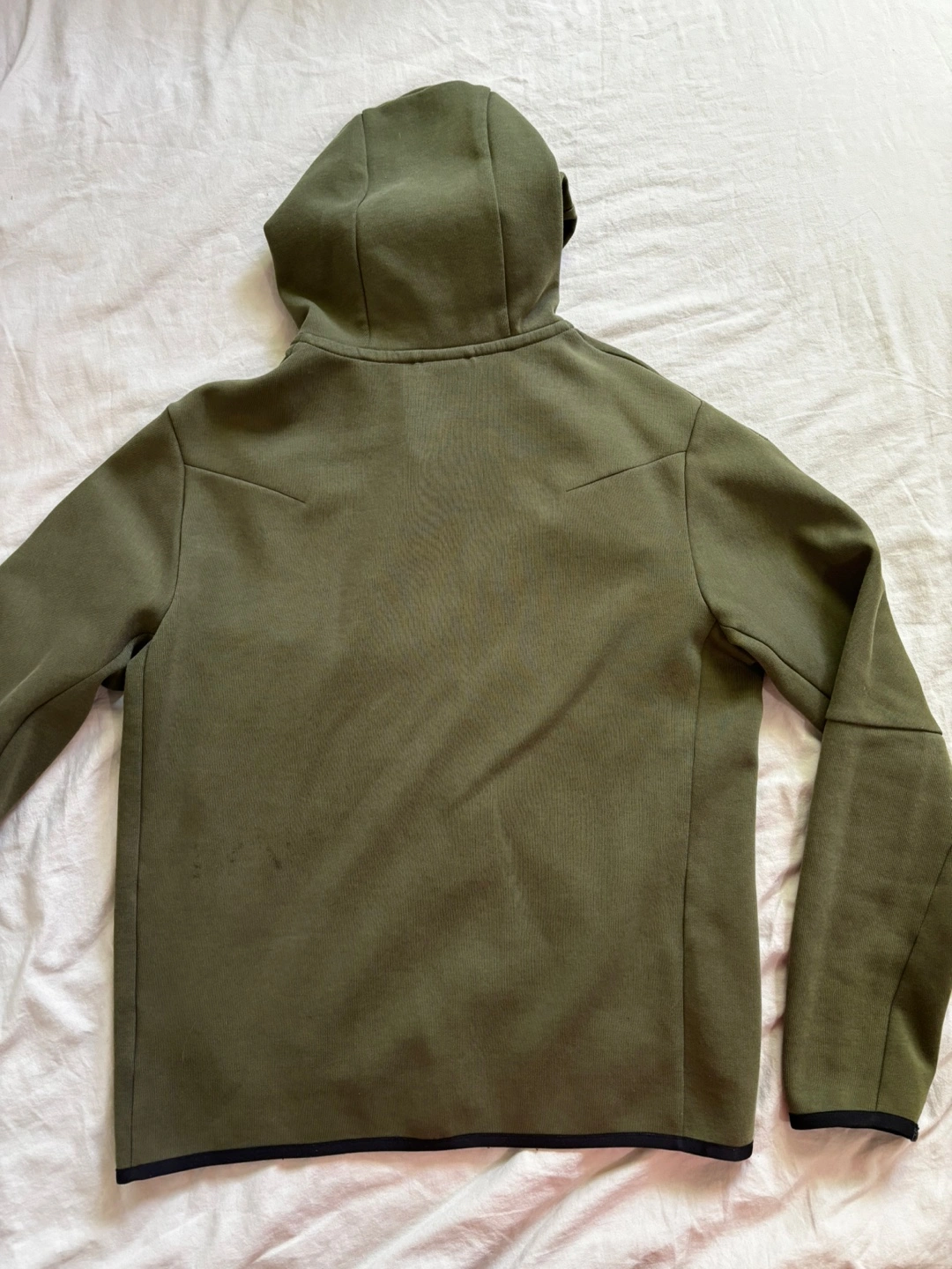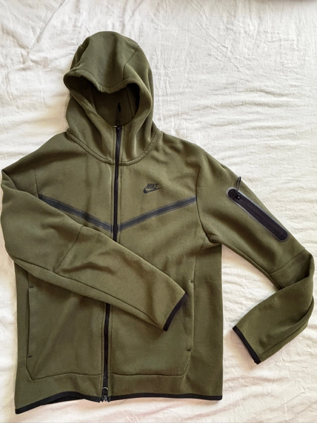 10Olive green hoodie. Full-zip closure. Features a hood and front pockets. Great for relaxing in on a cool evening.