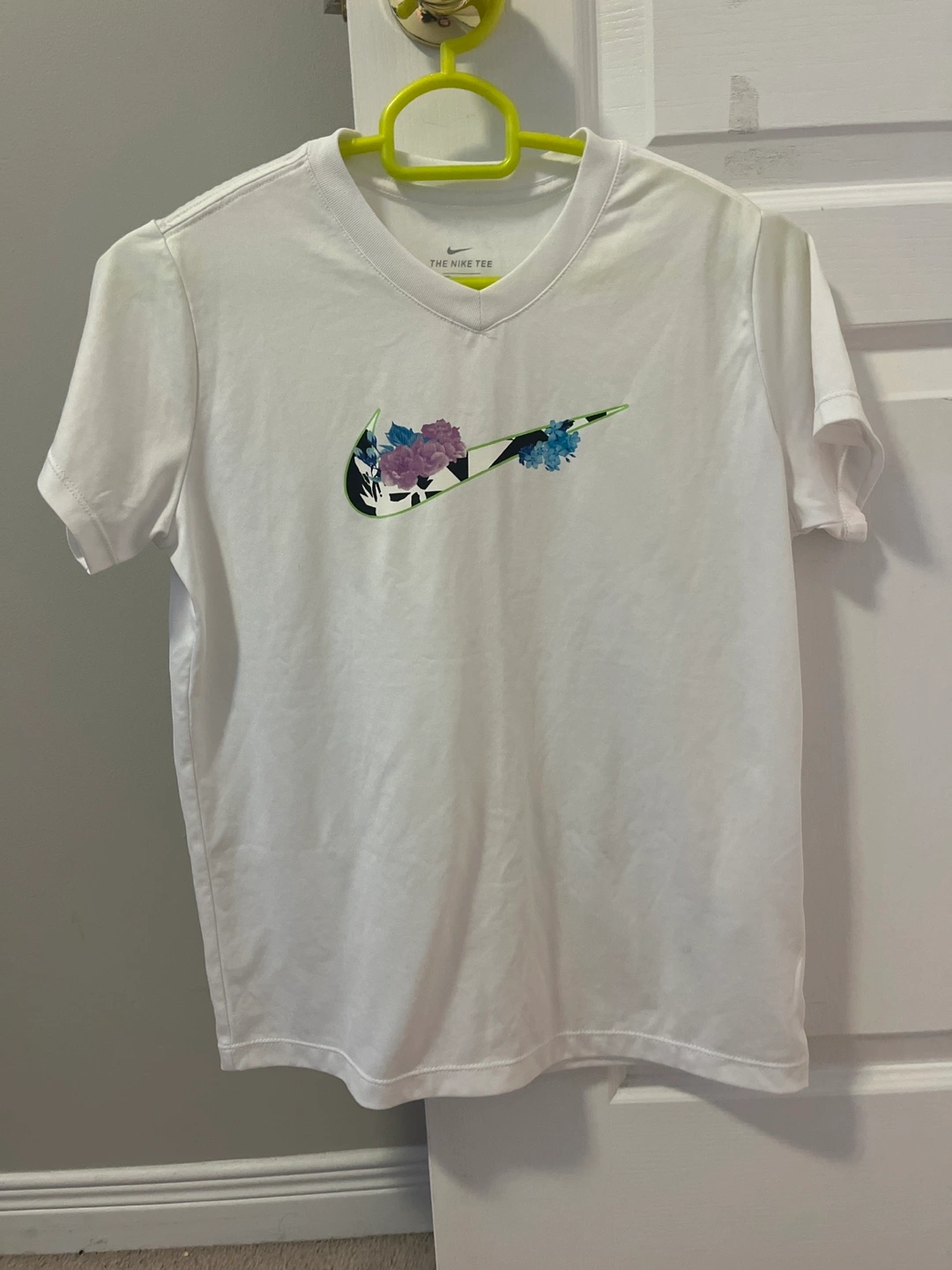 Selling a Nike 'The Nike Tee' in white with a floral swoosh design. It's in great condition!