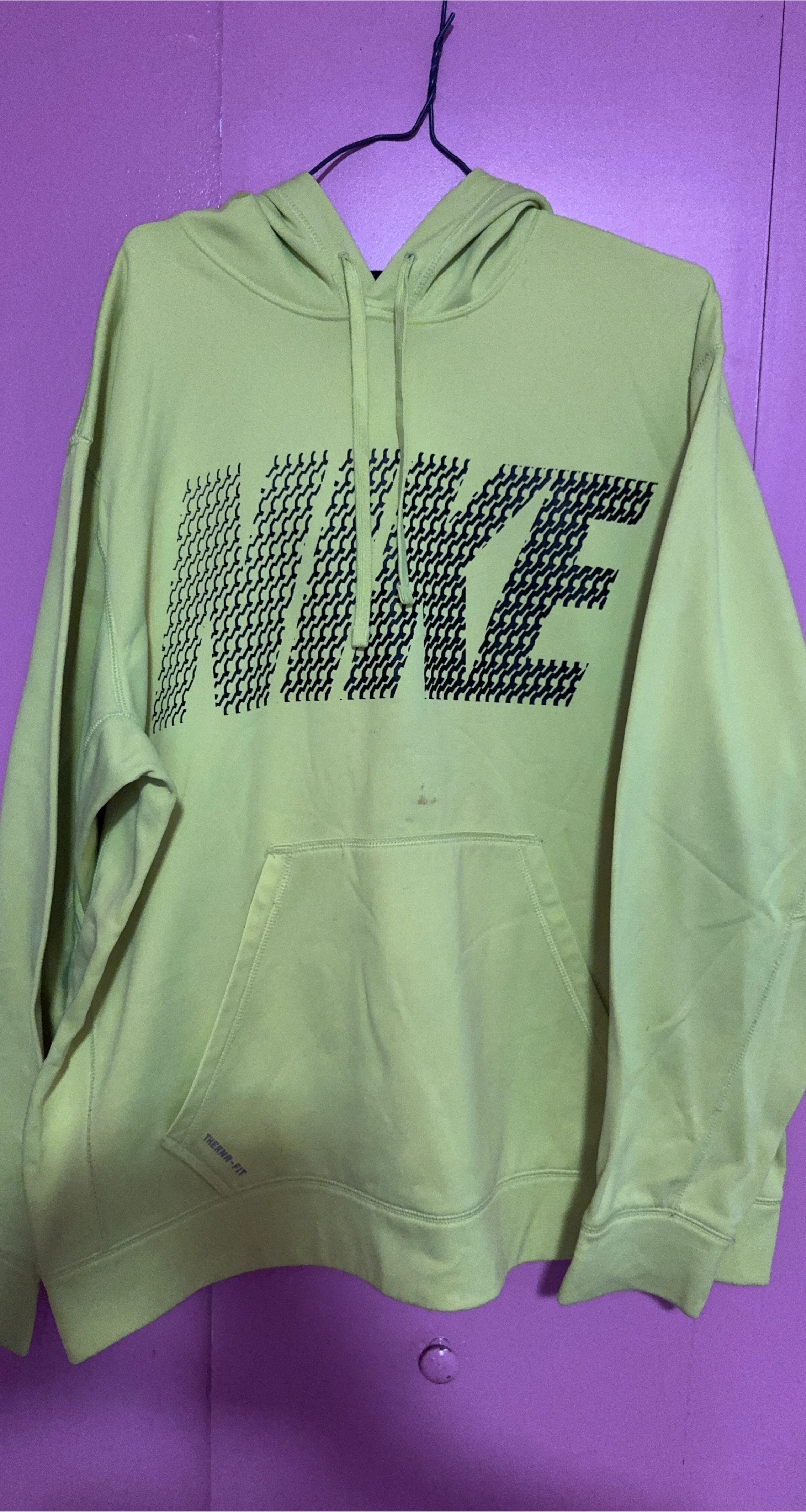 10Selling a Nike Therma-Fit hoodie in a light green colour. It has the classic Nike logo design. There are a few small spots on the front, but otherwise it's in good condition!