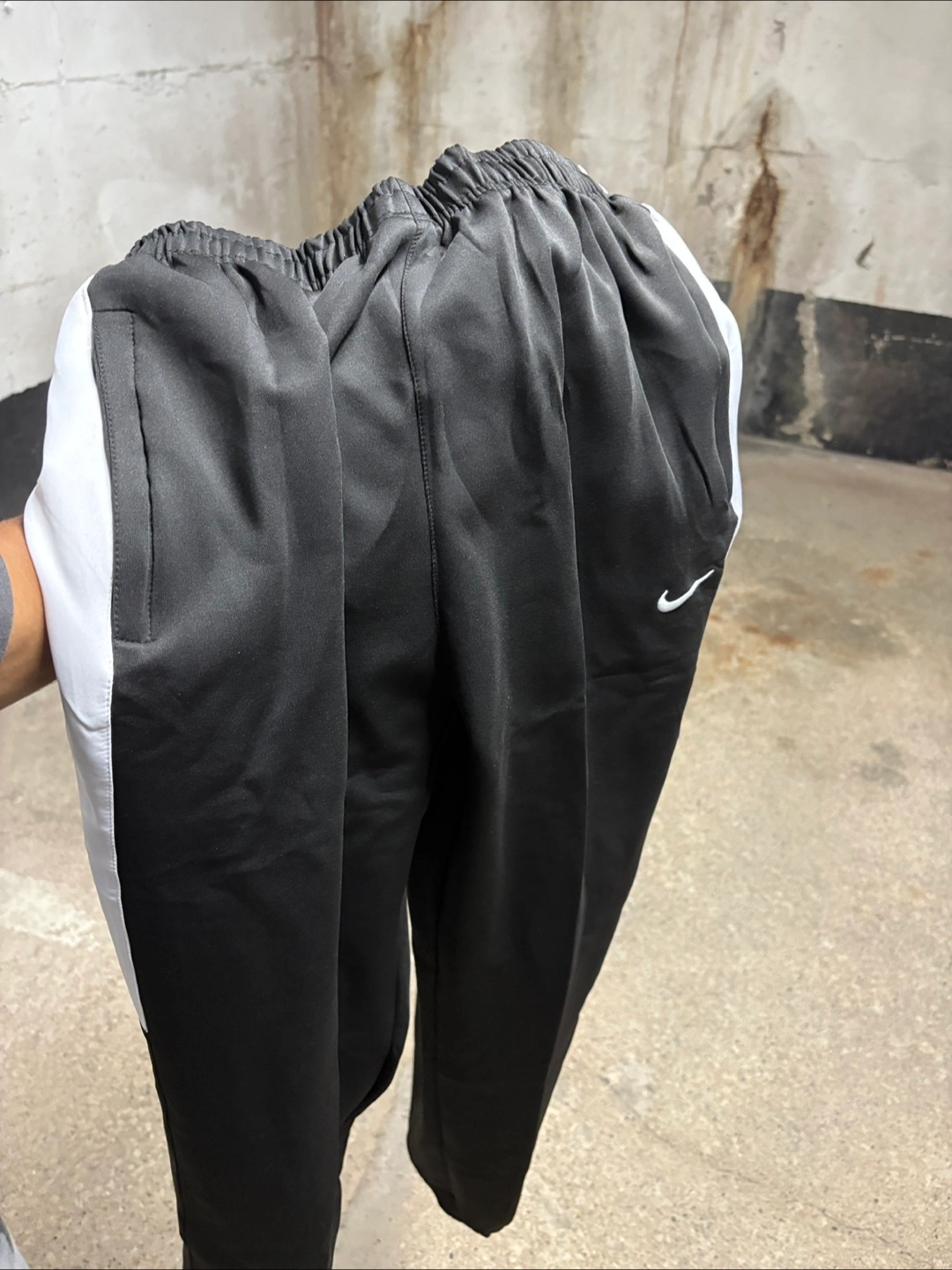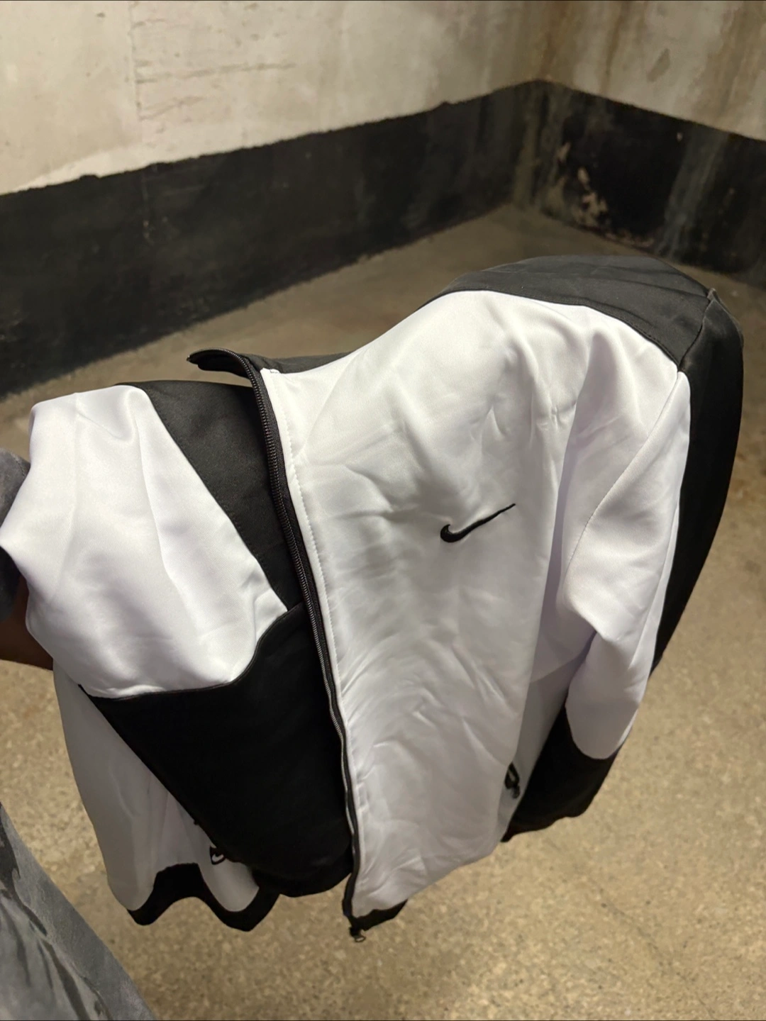 Selling a Nike tracksuit in black and white! It's in great condition and perfect for workouts or casual wear. The jacket has the classic Nike swoosh, and the pants are super comfy with an elastic waistband. A stylish and functional set!