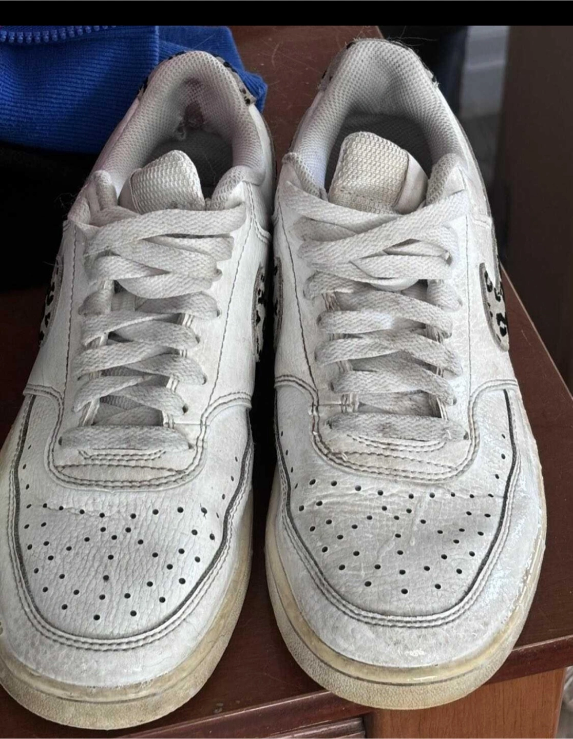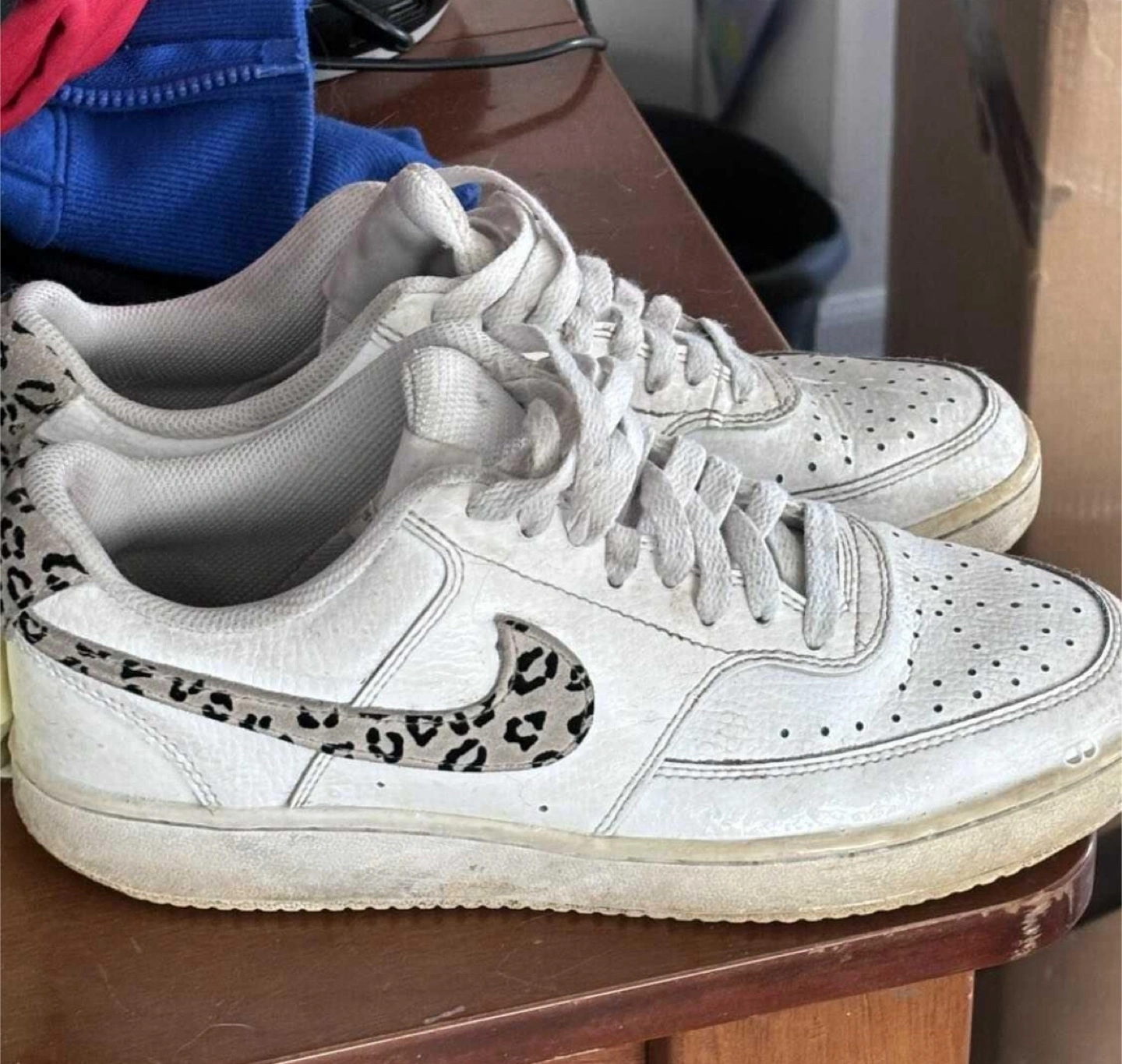 Selling a pair of Nike sneakers in white with a fun leopard print detail on the swoosh. They show some signs of wear, as you can see in the photos, but still have lots of life left! Perfect for adding a bit of flair to your everyday look