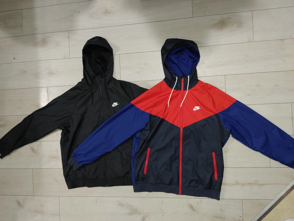 Two Nike windrunner jackets. One is black with a white swoosh and the other is black, red, and blue with a white swoosh.