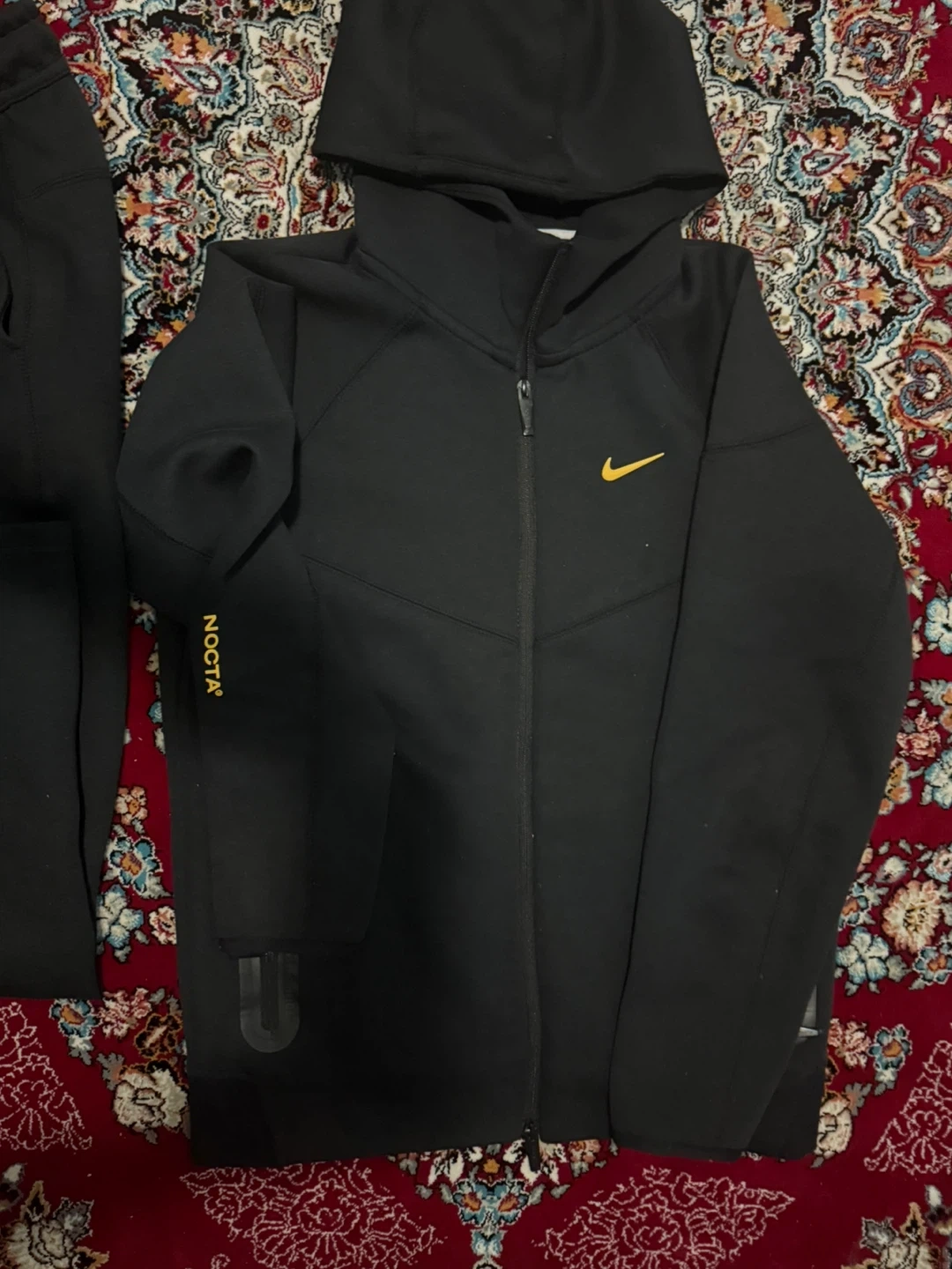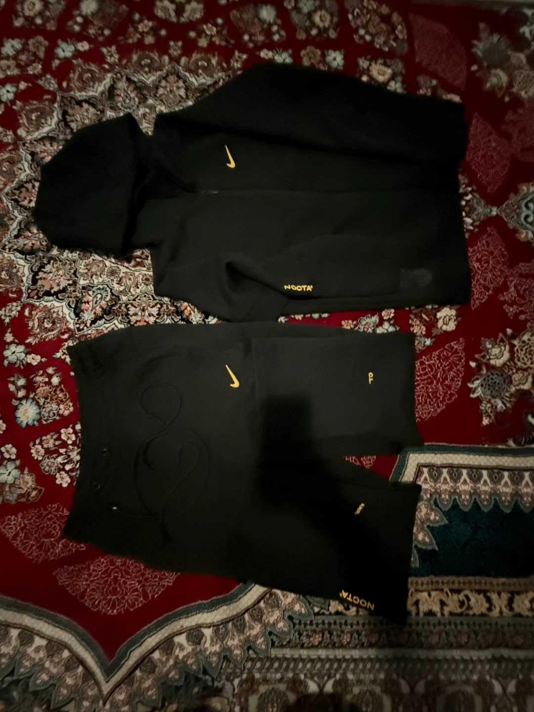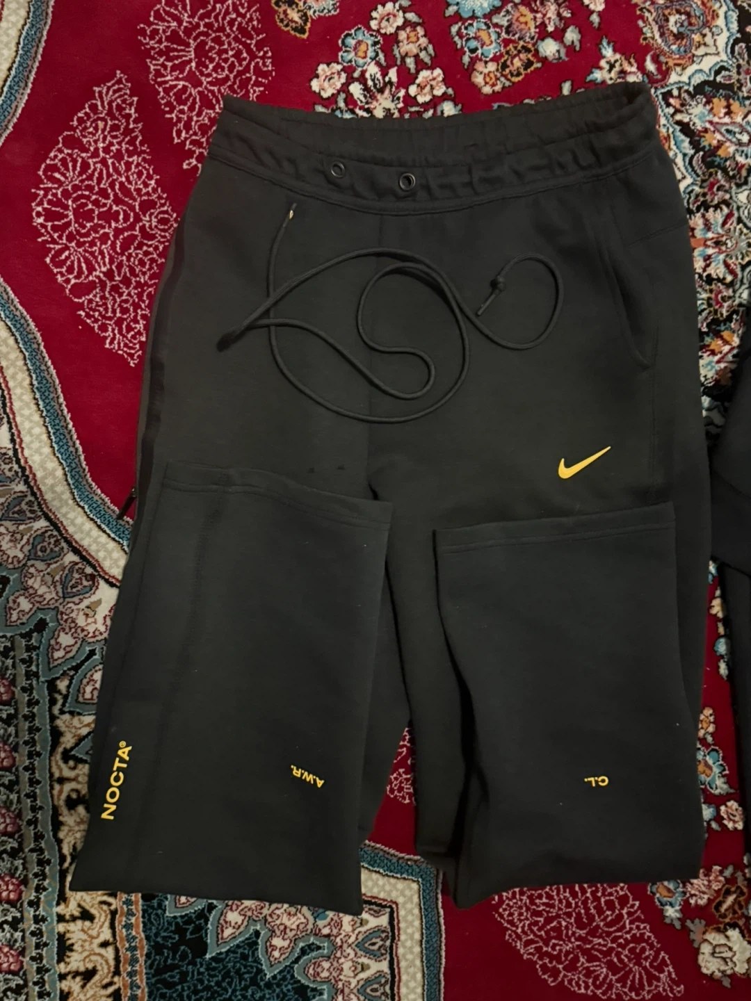 17Selling a Nike x Drake NOCTA AWR set, including both the pants and hoodie! The set is black with yellow detailing. The pants have 'NOCTA' printed on the leg, and the hoodie also features the NOCTA branding. This is a stylish and comfortable set for everyday wear!