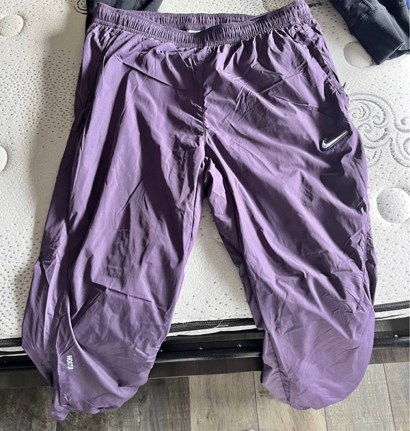 Selling a pair of Nike x Drake NOCTA pants in purple! These pants are great for sports or casual wear. They're lightweight and portable, making them perfect for any activity size XS fits kind of oversize