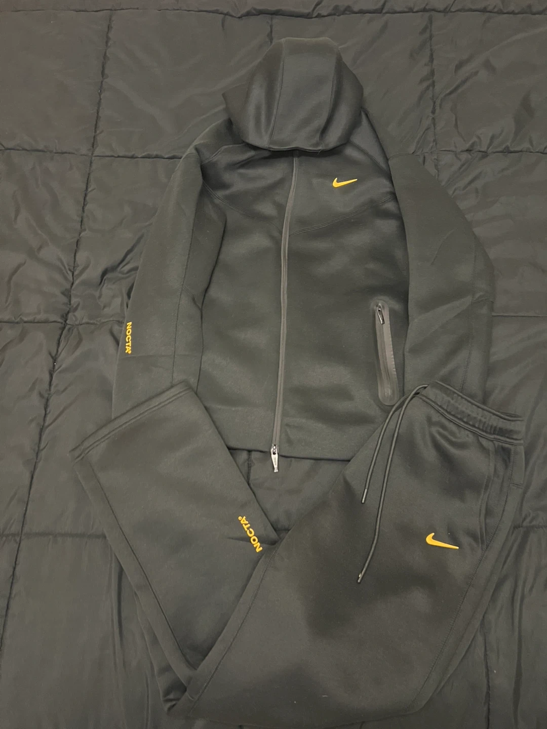 15Selling a Nike x Drake NOCTA tracksuit in size medium! Fits size small and medium The set includes both the zip-up hoodie and the matching pants. The colour is a sleek black with yellow accents. Perfect for workouts or just lounging around in style