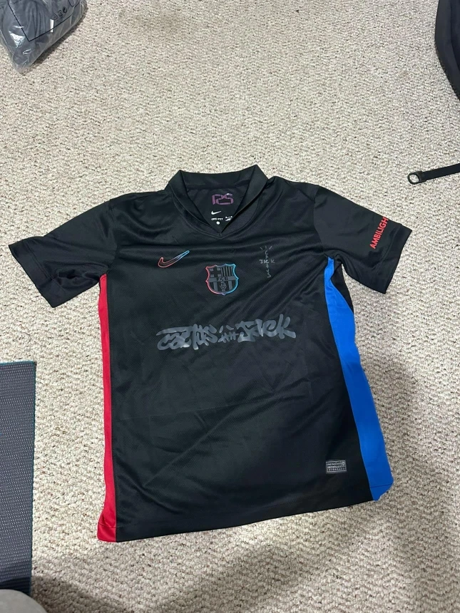 60Selling a cool Nike x Travis Scott FC Barcelona jersey! It's a unique piece with the Cactus Jack design and the FC Barcelona crest. The jersey features a black base with red and blue accents, and the Nike swoosh. Perfect for any fan of Travis Scott or FC Barcelona!