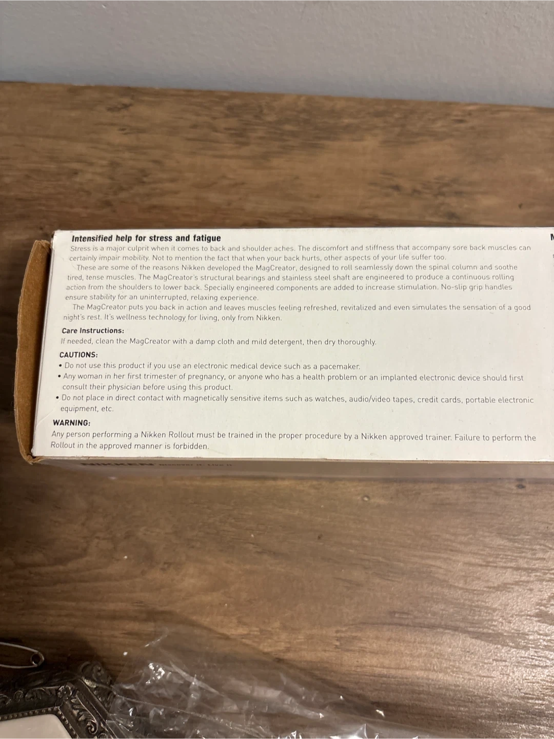 106Nikken Magcreator designed to roll seamlessly down the spinal column and soothe tired sore muscles The discomfort and stiffness that accompany sore back muscles can cause poor mobility The MagCreator's structural bearings and stainless steel shaft are engineered to produce a continuous rolling action from the shoulders to lower back Care instructions: clean the MagCreator with a damp cloth and mild detergent, then dry thoroughly