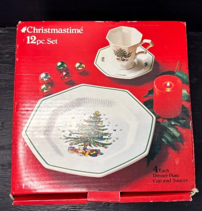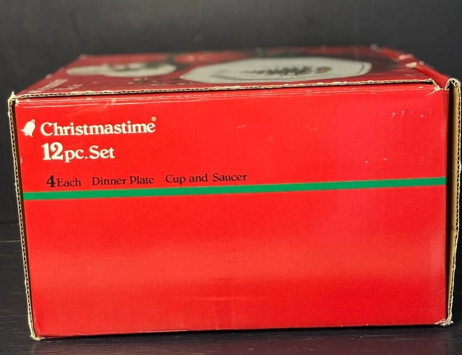15Cherish the magic of a holiday meal, with your family gathered around a beautifully set table with this Nikko Happy Holidays Christmas Tree 12 Piece Dinner Set. A fantastic way to create that classic, festive atmosphere, this festive dinnerware set has a charming Christmas tree design that is a timeless piece of holiday tradition that has graced tables for generations. Produced by Nikko, a company known for its quality and classic designs, this set features the iconic Happy Holidays pattern with a Christmas tree adorned with presents, toys, and garlands that evokes the wonder of the Christmas season. The elegant, uniquely shaped plates add a touch of sophistication, making it perfect for both formal Christmas dinners and casual holiday functions. A perfect way to frame that special holiday meal, this holiday dinner set will make every meal feel like a special occasion. This set is a wonderful way to start a new holiday tradition or to add a cherished, classic piece to your existing collection. This new old stock Nikko Happy Holidays Christmas Tree Theme 12 Piece Dinner Set contains -4 dinner plates -4cups and saucers Local pickup is in Etobicoke near Islington and The Westway. We offer shipping and local delivery for this item. Please send a message about availability and cost associated with these respective services. Alternately, if you wish to pay by credit card or Paypal and have it shipped, you can order it on our website by copying and pasting this link into your browser: https://hljathome.com/products/nikko-happy-holidays-christmas-tree-theme-12-piece-dinner-set