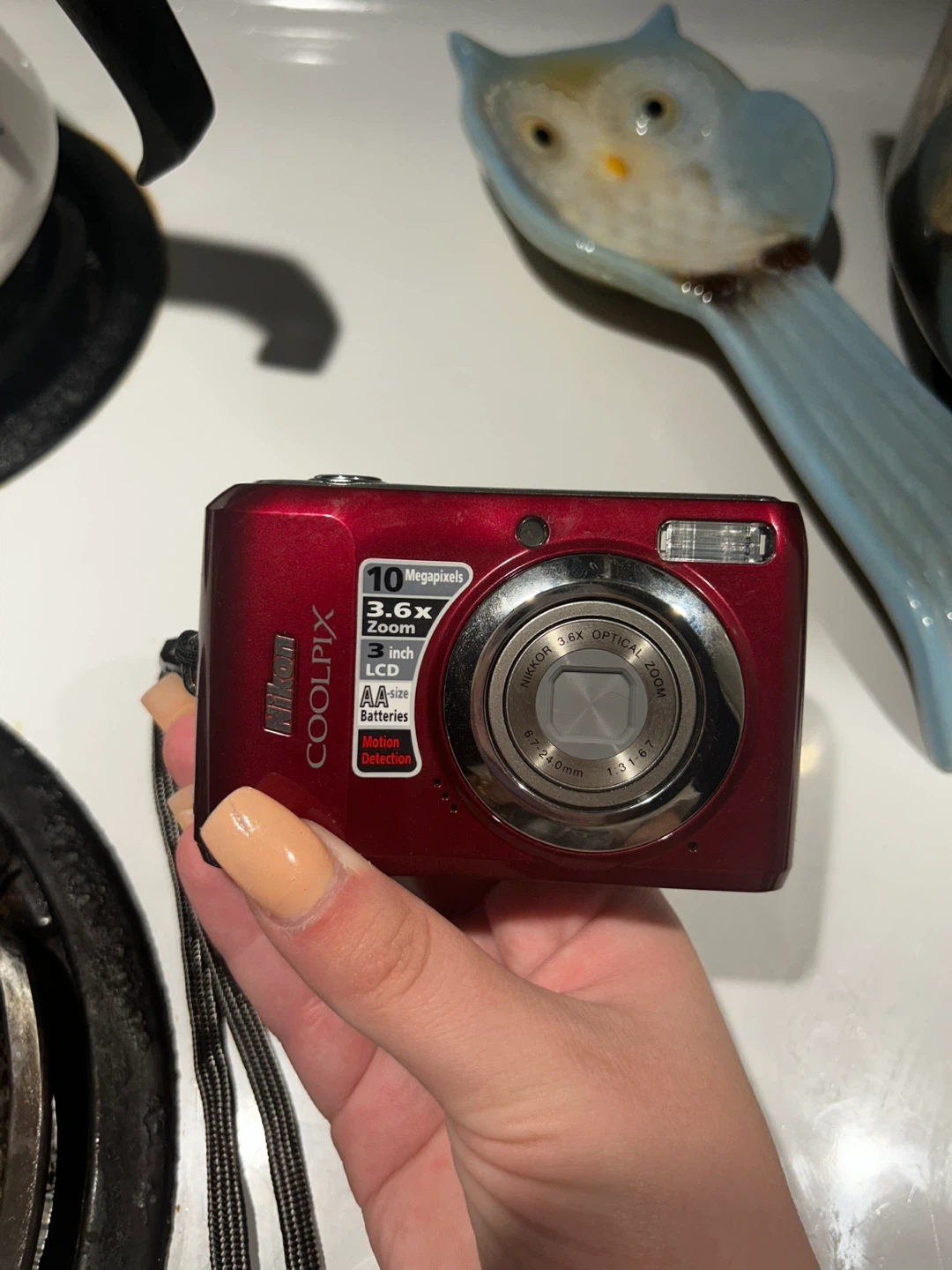 Selling a Nikon COOLPIX L20 digital camera in a lovely red colour! It features 10 megapixels and a 3.6x optical zoom. It uses AA batteries. Perfect for someone looking for a simple, easy-to-use camera. *Does not turn on. Maybe I’m using the wrong batteries that aren’t strong enough idk . Selling as is * 🎀Bundle items for discounts when purchasing more then one item🎀