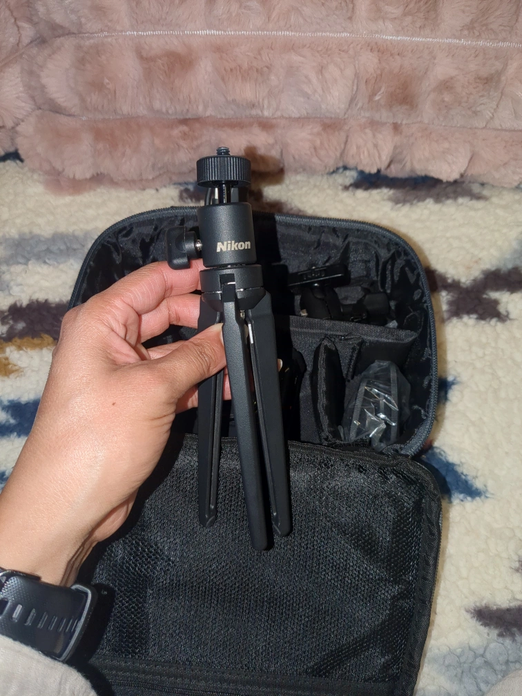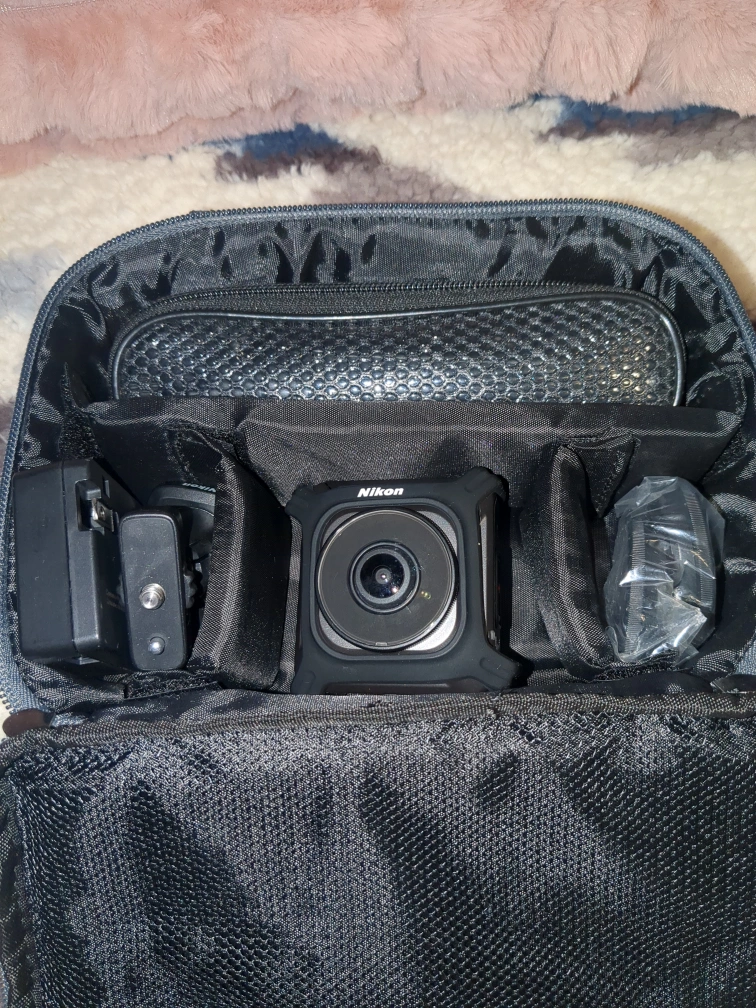 Nikon KeyMission 360 action camera. Includes carrying case, tripod, and additional lens attachments. Great for capturing immersive 360° footage.