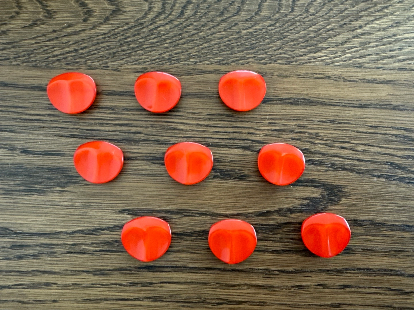 289Nine bright red buttons. Approximately 1 cm diameter. Two small holes for sewing. Smoke-free, pet-free home.