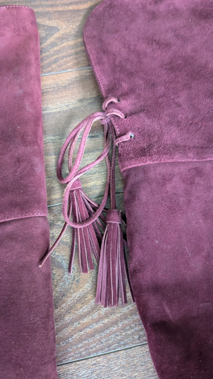 Selling a pair of burgundy over-the-knee boots. They are made of suede and have a stylish tassel detail. There are some signs of wear on the heels, as shown in the photos. size 8.5