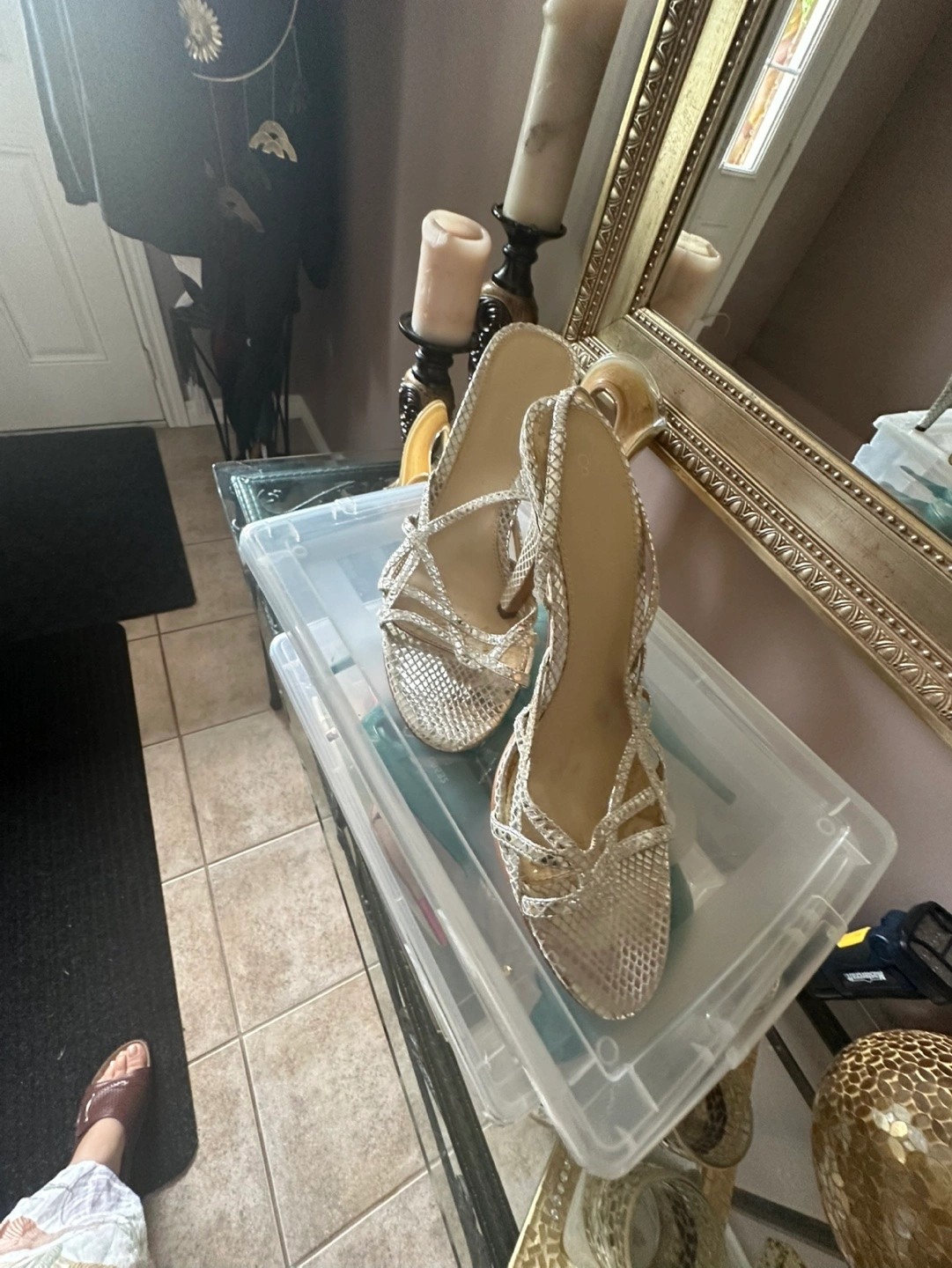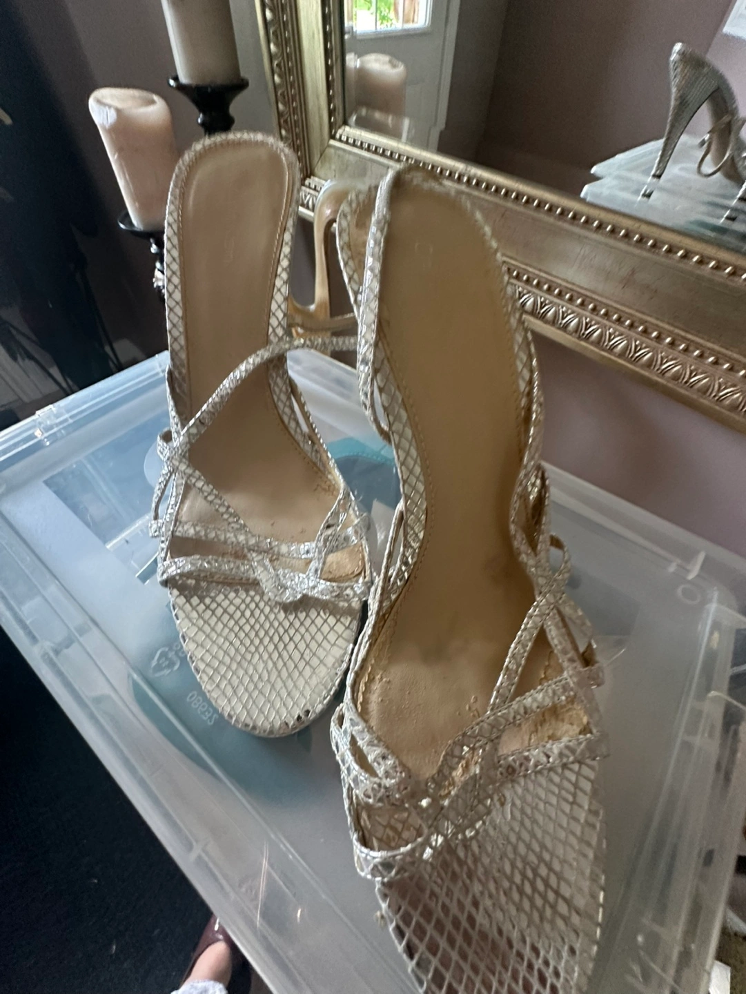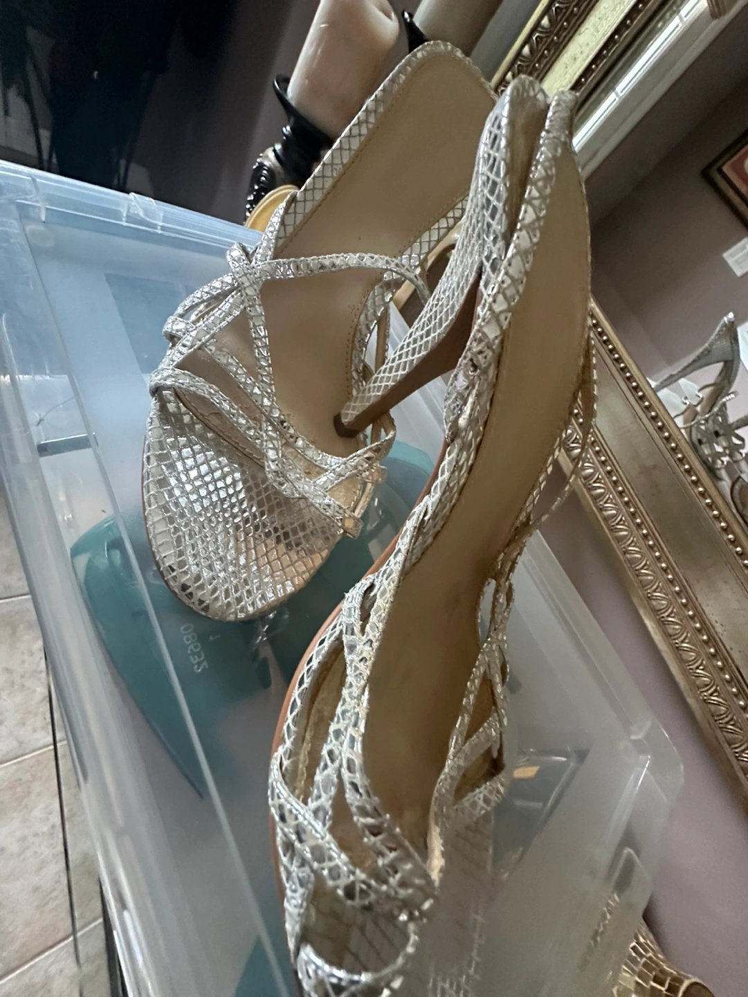 Elegant silver high heels. Snakeskin pattern. Strappy design. Slight wear visible.