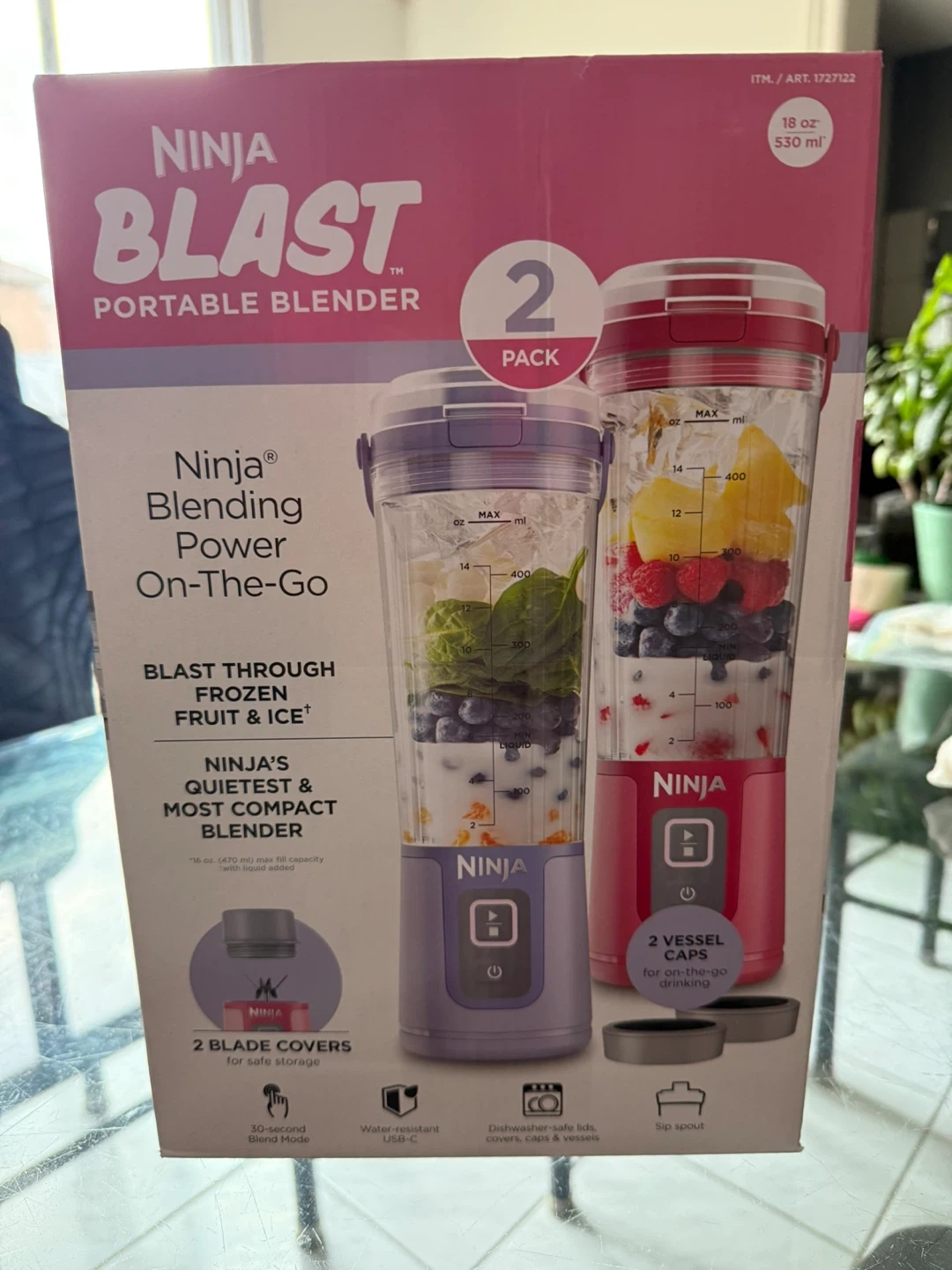 15Selling a brand new Ninja Blast portable blender, still in its original packaging! This is a 2-pack, perfect for on-the-go smoothies and drinks. It blasts through frozen fruit and ice with ease! It features a 30-second blend mode, water-resistant USB-C, and dishwasher-safe lids, covers, caps, and vessels. Each blender has a 16 oz (470 ml) max fill capacity with liquid added, and the total capacity is 18 oz (530 ml). Also includes 2 blade covers for safe storage and 2 vessel caps for on-the-go drinking