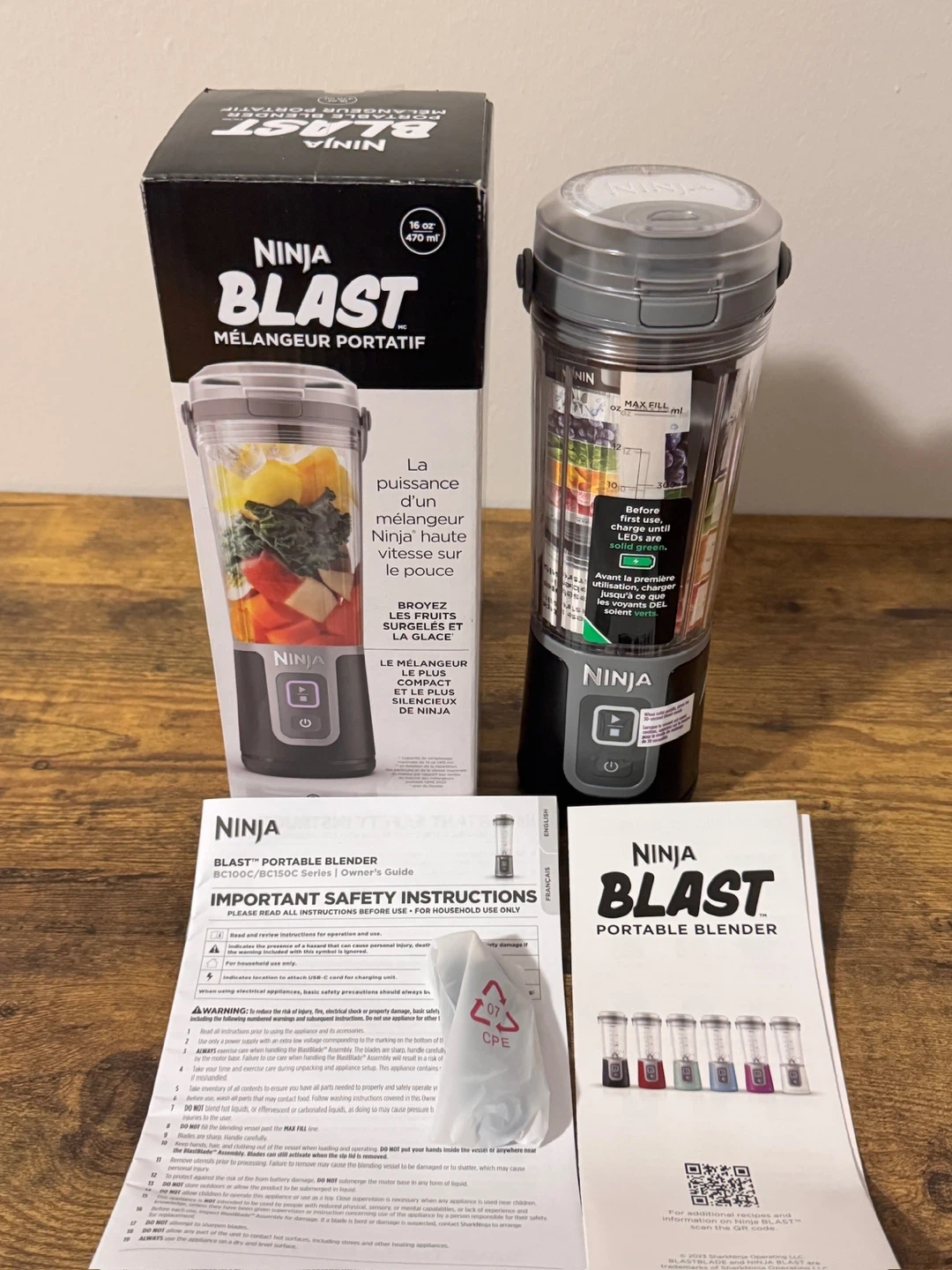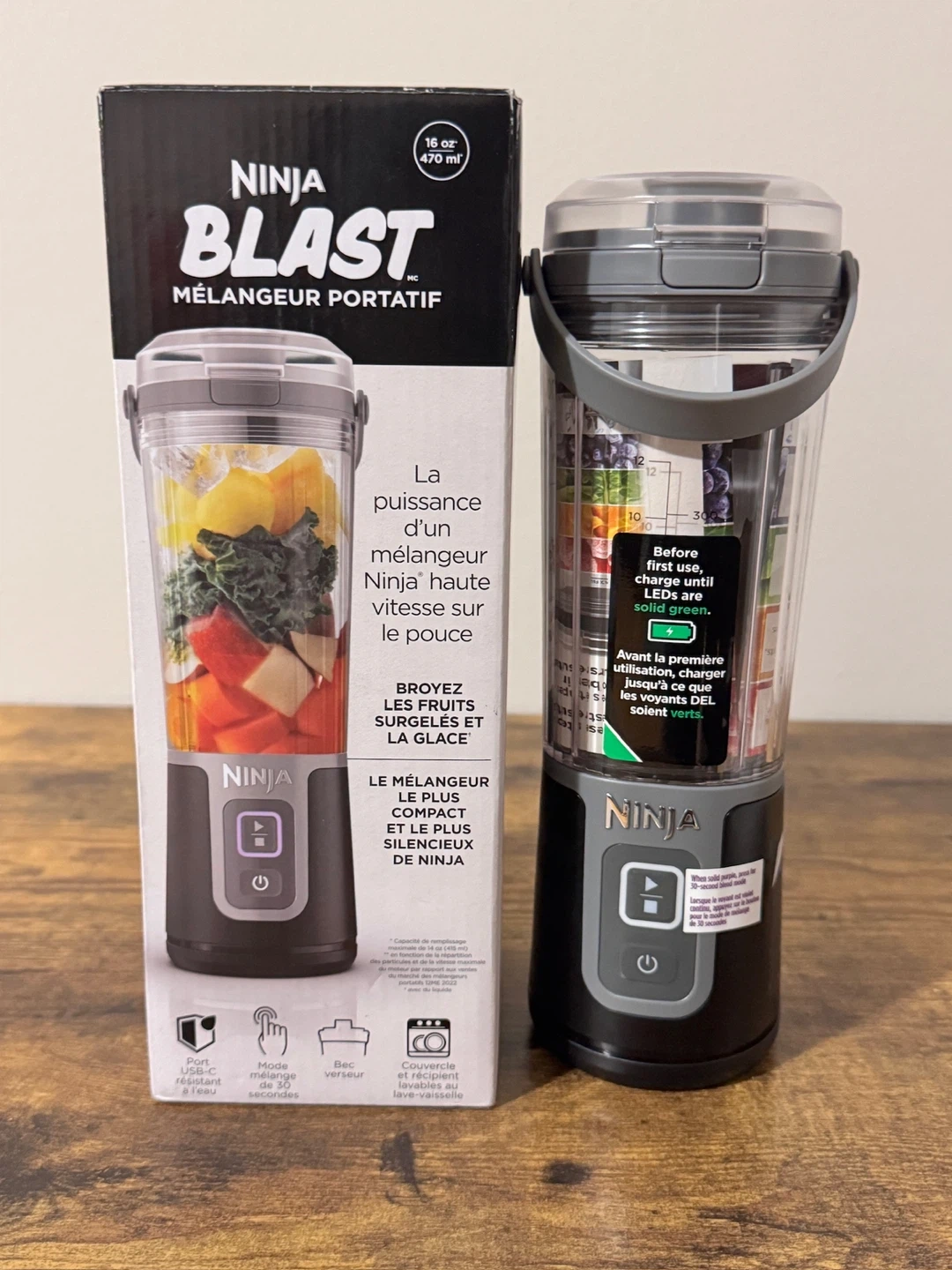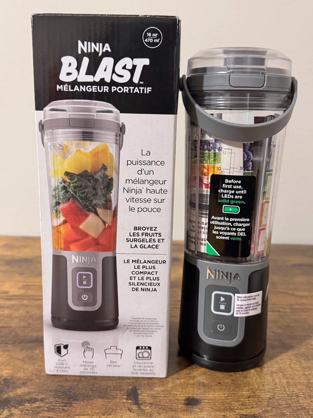 72Ninja Blast Portable Blender, Cordless, 16oz. Vessel, Personal Blender for Shakes & Smoothies, BPA Free, Leakproof Lid & Sip Spout, USB-C Rechargeable, Dishwasher Safe Parts, Black, Brand Ninja Colour: Black Special Features: Cordless, Portable, Single Serve, USB Rechargeable Capacity: 454 g Product Dimensions: 9D x 9W x 25.6H Centimetres Material: Stainless Steel NINJA BLENDING ANYWHERE: Power through frozen ingredients with Ninja’s best portable blending power. Prepare perfectly smooth drinks anywhere you go. 16-OZ VESSEL: Ideal for smoothies, protein shakes, and frozen beverages. EASY TO CARRY: Transport your drink conveniently with a comfortable, hinged carry handle. SIP LID: An easy-to-open sip lid enables blending and drinking in the same vessel. EASY TO CLEAN: The lid and vessel are BPA-free and dishwasher-safe. The blender can also undergo self-cleaning with a 30-second blend cycle using water and a drop of dish soap. NINJA BLAST TECHNOLOGY: The ribbed vessel generates a vortex, while the durable stainless steel BlastBlade Assembly efficiently breaks through ice and frozen ingredients. SEPARATE POWER & BLEND BUTTONS: With distinct power and blend buttons, unintentional blending is minimized. RECHARGEABLE BASE: A nonslip, USB-C compatible base provides up to 15 blends on a single charge. A full charge typically takes approximately 2 hours.