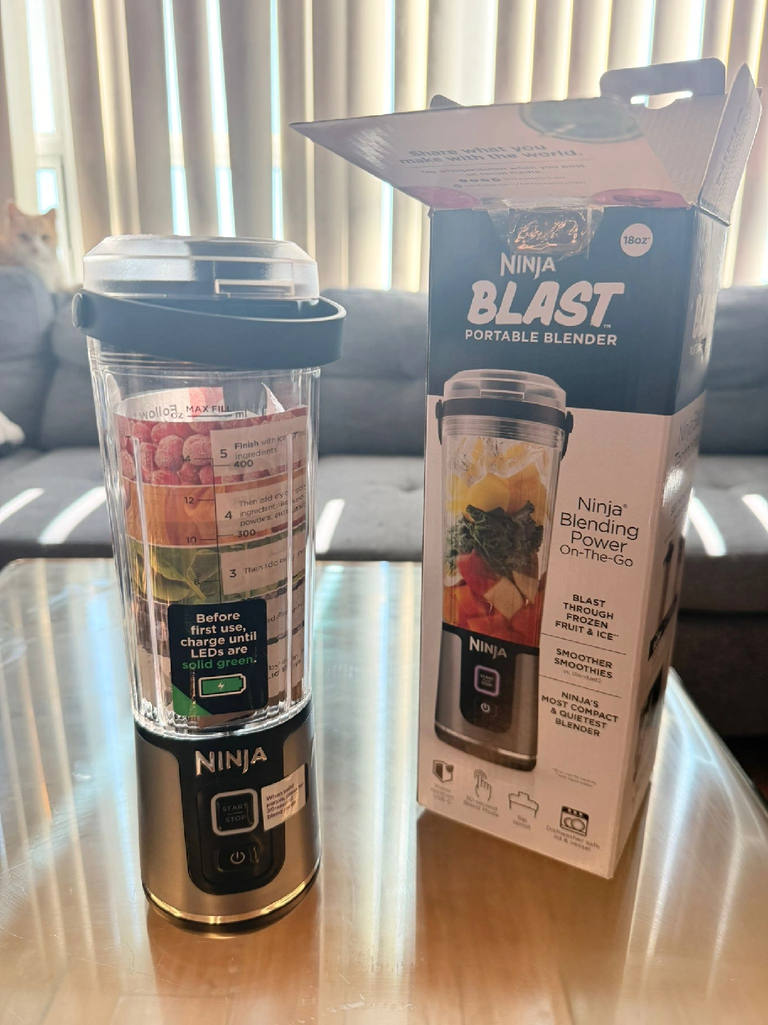 Selling a Ninja Blast portable blender in excellent condition! It's perfect for on-the-go smoothies and blending frozen fruit and ice. It's Ninja's most compact and quietest blender. The box is included. Features include water resistant USB-C charging, 30-second blend mode, sip spout, and dishwasher-safe lid and vessel