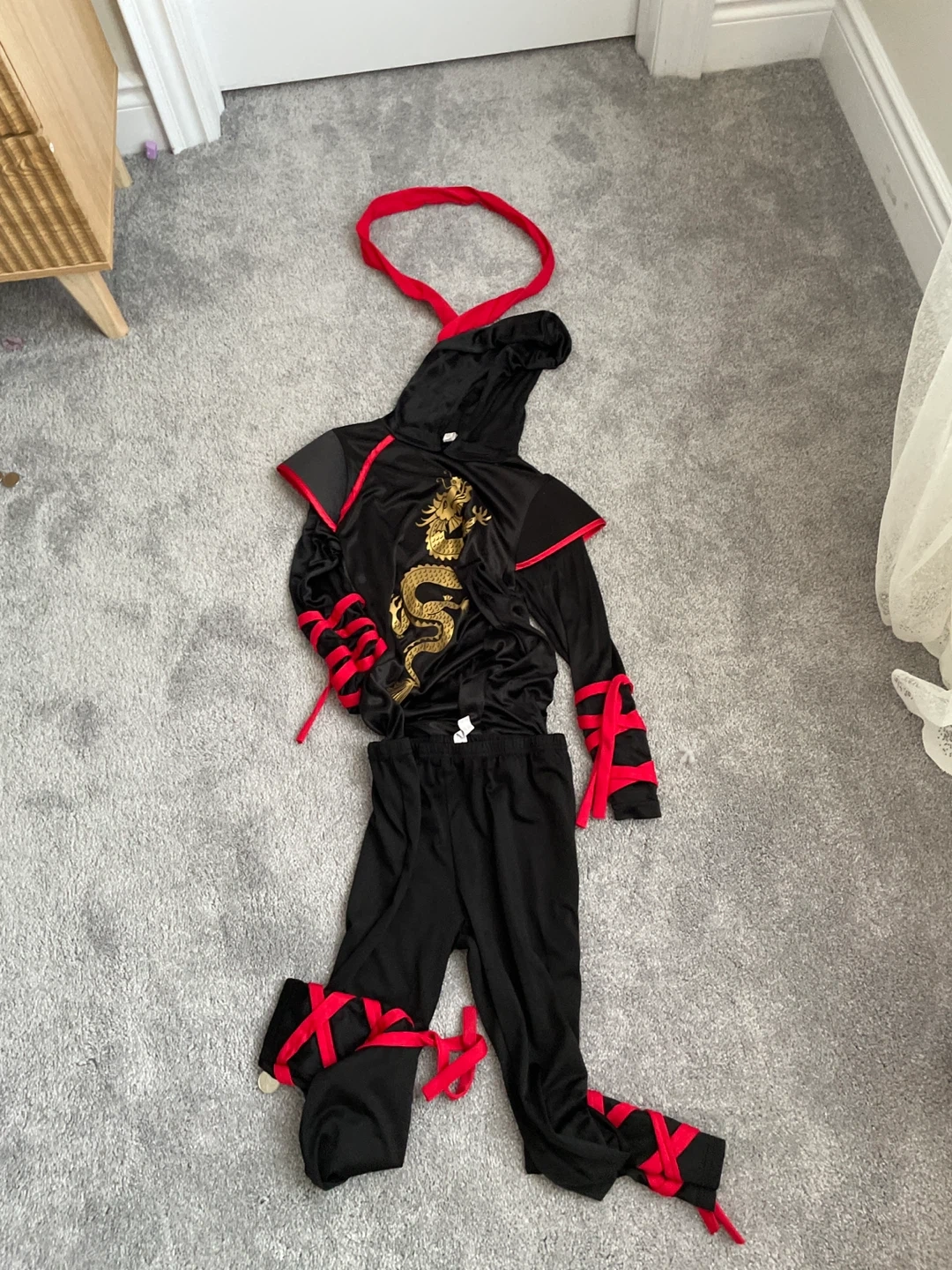 15A fun ninja costume for kids! This set includes the hooded top with a gold dragon design, pants, and a red headband. Perfect for dress-up or Halloween!