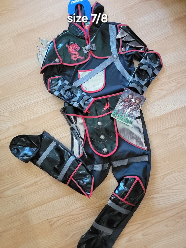 Cool ninja costume for kids! It's in size 7/8 and features a dragon design on the chest. Perfect for dress-up or Halloween