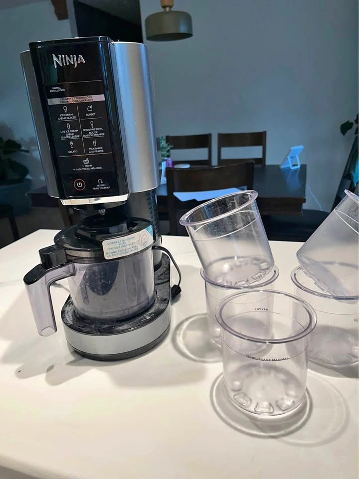 Works perfect - we just don’t use it enough to keep it. The only damage is a spot on the top as pictured where it was set too close to our under cabinet lights and they melted the plastic slightly. Comes with 6 cups / lids so you can bulk prep the creamis.