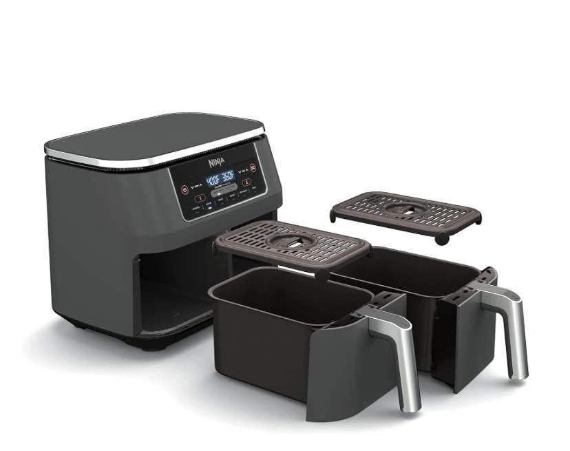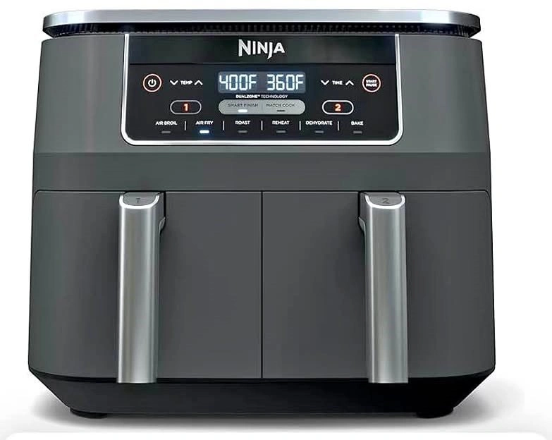 5Versatile and powerful air fryer with 6 cooking functions: Air Fry, Air Broil, Roast, Bake, Reheat, and Dehydrate. Features two independent 4-quart baskets, each with its own silicone liner, cyclonic fan, and rapid heater. Cook two different foods at once with separate settings and timers. Great for quick, healthy meals with minimal cleanup.