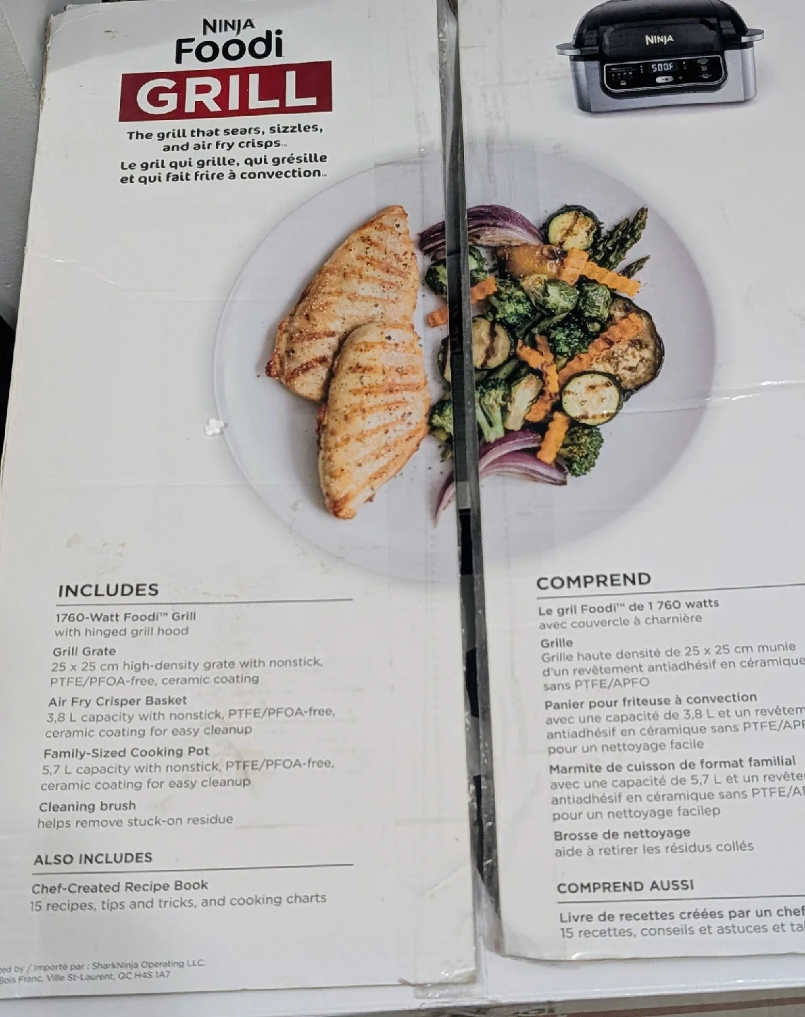 22Selling a Ninja Foodi 4-in-1 Non-Stick Indoor Grill with Air Fryer in stainless steel and black. It's in great shape and comes with the box! This model is perfect for grilling, air frying, roasting, and baking. It has a 5.7L capacity family-sized cooking pot. The grill grate is 25 x 25 cm with a nonstick, PTFE/PFOA-free, ceramic coating. Includes a chef-created recipe book with 15 recipes, tips, and cooking charts