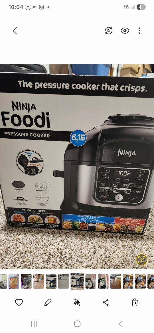 16Selling a Ninja Foodi pressure cooker that crisps! It's in new condition and comes with the box. This pressure cooker has a 6.15L capacity and features TenderCrisp technology for crispy results. It's perfect for cooking chicken and other dishes quickly and easily!