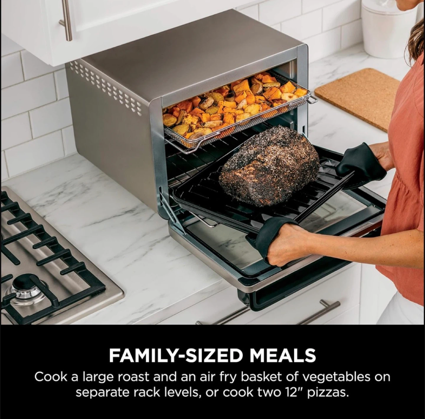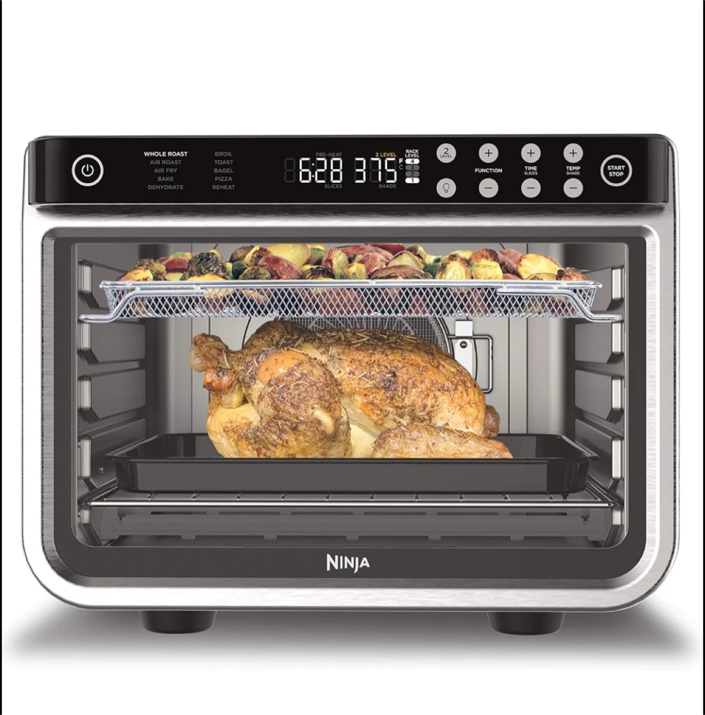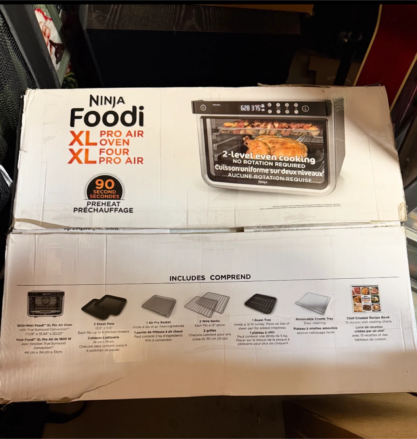 110I'm selling a Ninja Foodi XL Pro Air Oven. It has an XL capacity with an oven cavity that measures 14.47" W x 12.72" D x 11.08" H, making it easy to cook 2-level meals. It also includes several accessories such as 2 sheet pans, 1 air fry basket, 2 grills, and 1 roast tray. It also comes with a removable crumb tray for easy cleaning and a chef-created recipe book with 15 recipes and cooking charts