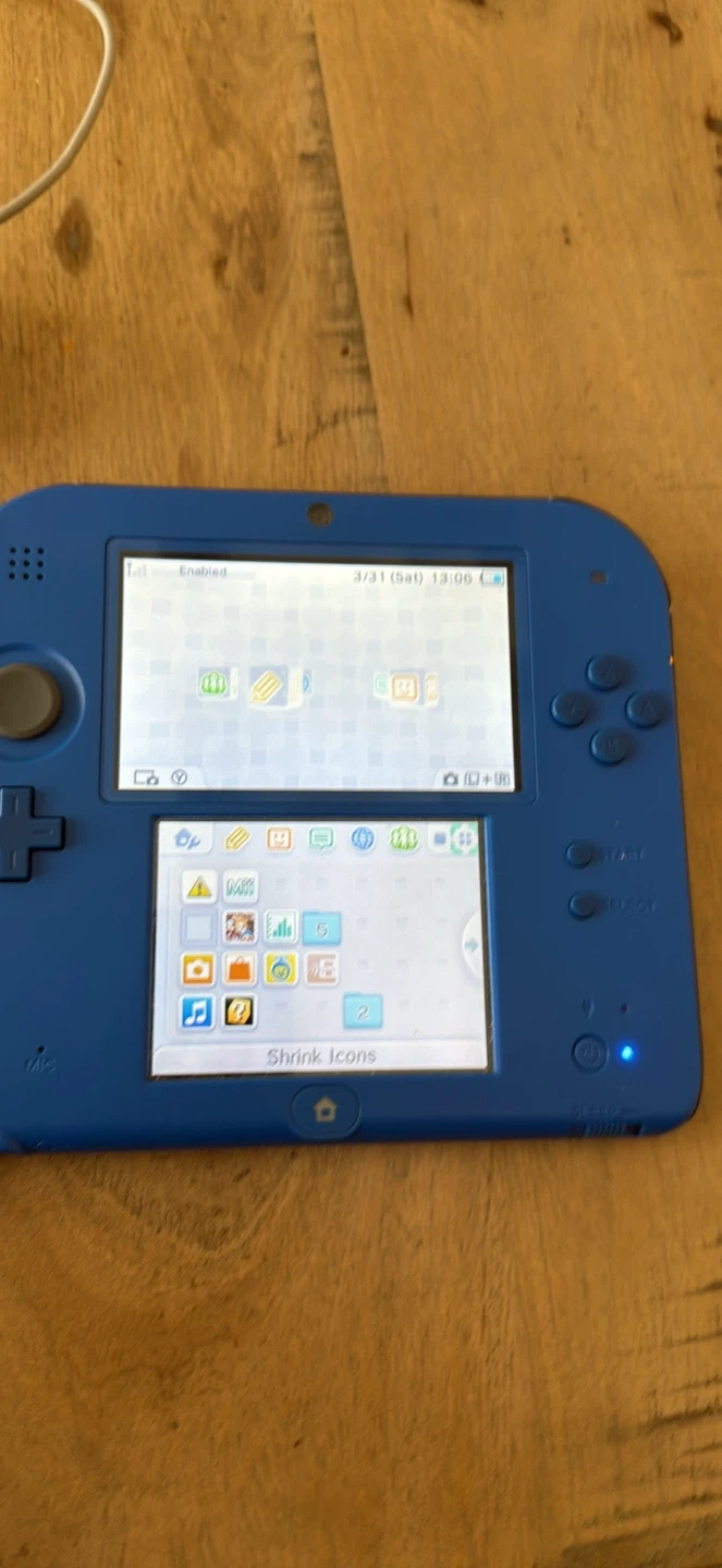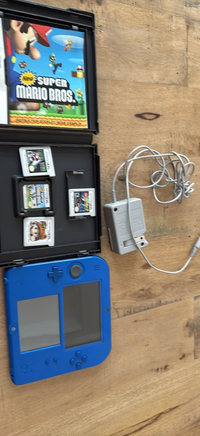 0Selling a blue Nintendo 2DS handheld console. It comes with a charger and several games, including New Super Mario Bros
