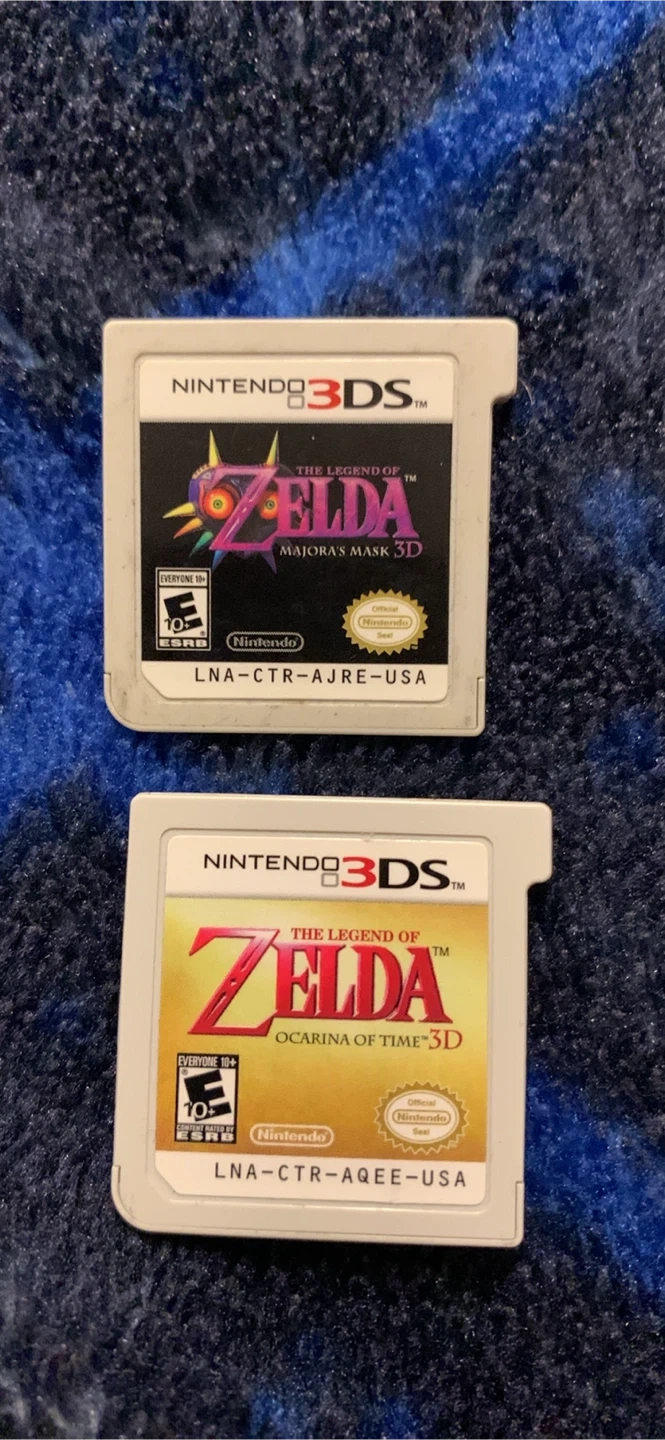 25Selling two Nintendo 3DS Zelda games! Included are The Legend of Zelda: Majora's Mask 3D and The Legend of Zelda: Ocarina of Time 3D. Both games are rated E10+ by the ESRB. Perfect for any Zelda fan!