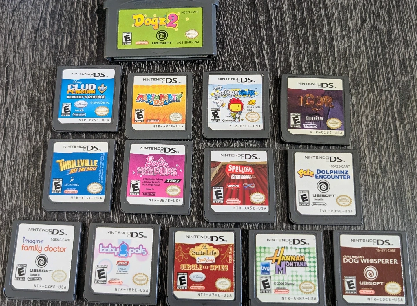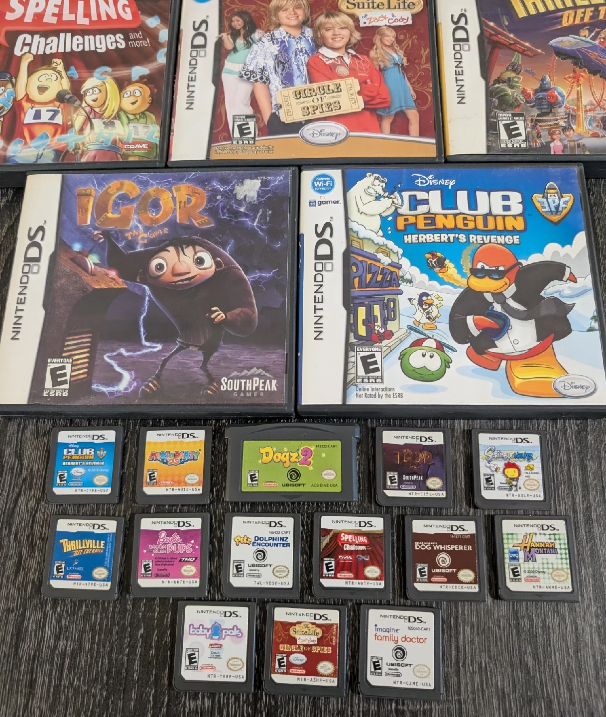 10Nintendo Game Lot: ( 14 games in total ) Comes with 1 gameboy game and 13 DS games. 5 games come CIB with cases as shown in the picture. Game List: 1. Marioparty DS 2. Scribblenauts 3. Club Penguin - Herbert's Revenge 4. Igor - the game 5. Cesar Millans Dog Whisperer 6. Petz Dolphinz Encounter 7. Thrill ville off the rails 8. Barbie groom and glam pups 9. Spelling Challenges and more 10. Imagine Family Doctor 11. Hannah Montana 12. The Suite life of Zack and Cody 13. Baby pals 14. Dogs 2 ( gameboy ) Pick up is in st. Vital area. Thanks