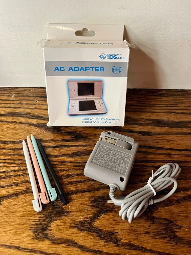142Get ready to power up your Nintendo DS Lite with this AC adapter and stylus bundle! This third party Nintendo DS Lite AC adapter is in good working condition, ready to keep your handheld charged for hours of gaming fun. Comes with four styluses, so you'll always have a spare on hand. * Compatible with Nintendo DS Lite * Input: AC 100-250V, 50/60Hz * Output: DC 5.2V 450mA I have many available. Check out my other listings for more cool stuff!