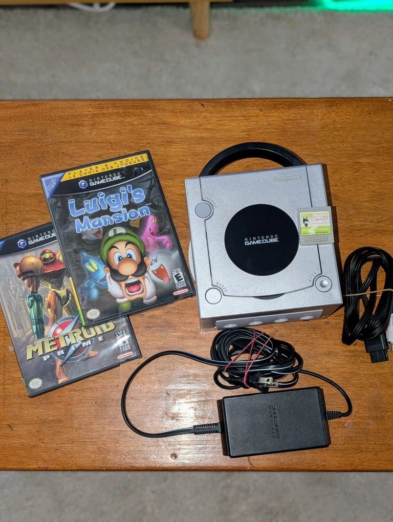 79Selling a silver Nintendo GameCube! It's in perfectly working condition and comes with a new power adapter and AV cables so you can hook it up and start playing right away. Original memory card included: Animal Crossing memory card (4 MB/59 blocks). Metroid Prime (CIB w/ manual) Luigi's Mansion (CIB w/ manual) Total bundle = $170 or best offer -------------- VALUE* -------------- • Console + cables + memory card: $70 • Metroid Prime (CIB w/ manual): $50 • Luigi's Mansion (CIB w/ manual): $75