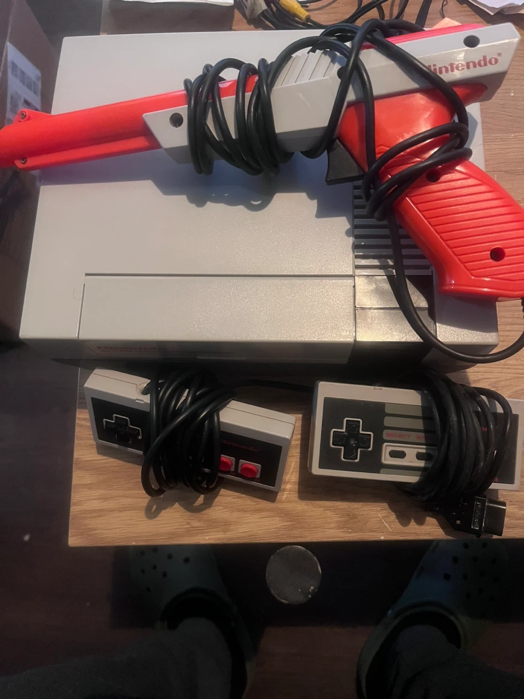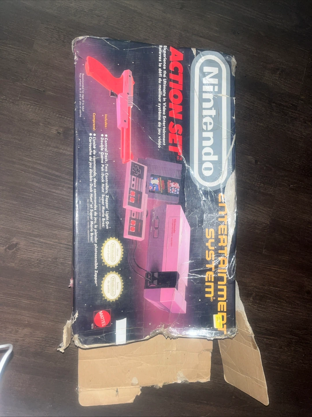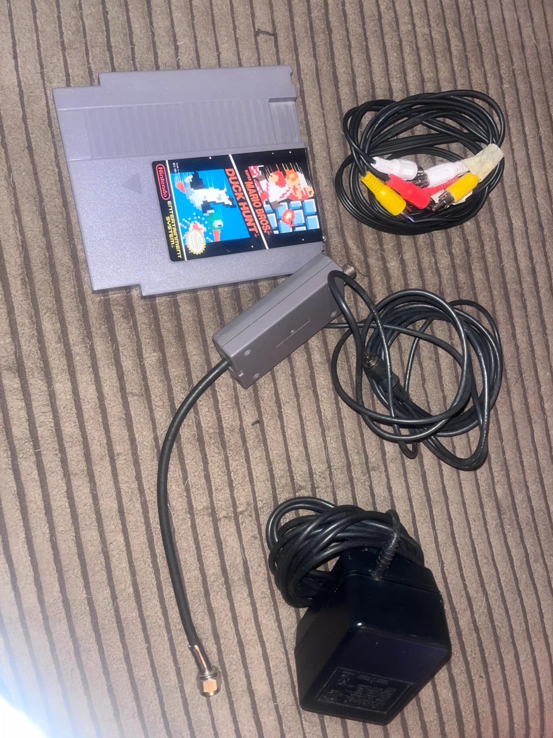 NES action set, comes with console, 2 oem Nintendo controllers, one oem zapper gun, duck hunt/ Mario game, comes with oem power cord, oem “RF switch wire adapter”, oem action set box (in rough shape) and rca’s EVERYTHING TESTED AND WORKING Asking $180 obo Pick up Pitt Meadows bc Shipping at buyers expense is available