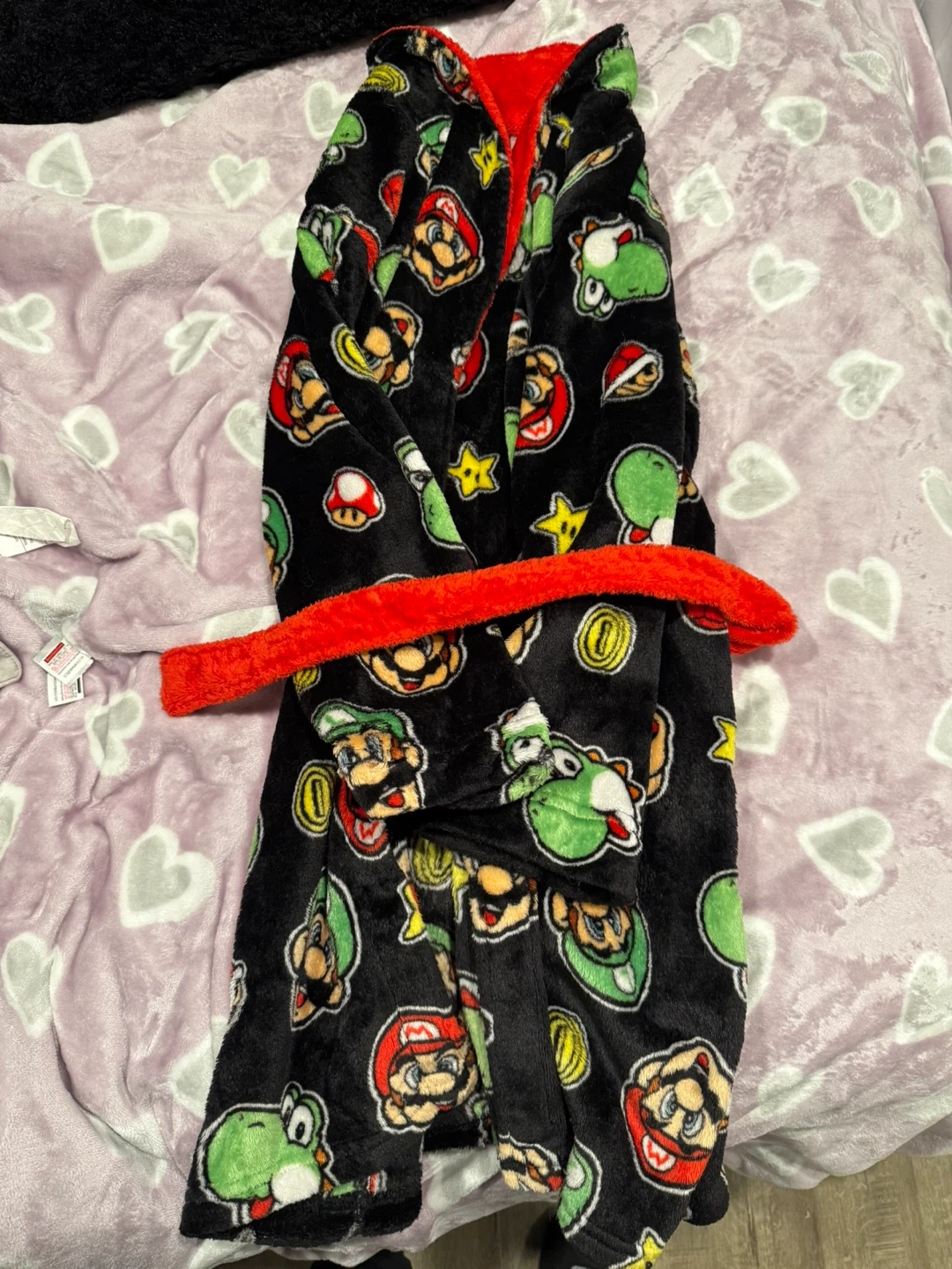 21Cozy Nintendo Super Mario-themed bath robe! Features Mario, Luigi, Yoshi and other iconic images from the game. Great for any Nintendo fan! Kids 10-12 but could fit smaller