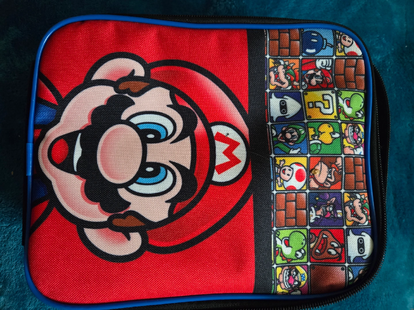 65Keep your lunch cool with this Super Mario lunch bag! It features a fun design with Mario's face and classic game characters. Perfect for school or work