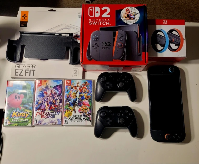 10Nintendo Switch 2 Bundle Comes with Screen Protecter (one already on it and one extra) Controller GameGrip Joycon Wheels 2 Switch 1 Pro Controllers (one of them has wierd drift on the left stick) Kirby the forgotten land Super Smash Bros Ultimate Fire and Emblem Engage I already factory reset the console so its all ready to go to a good home !